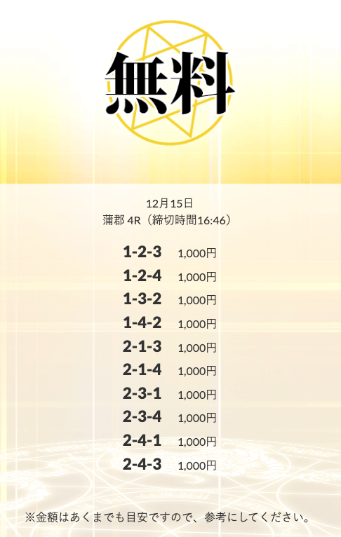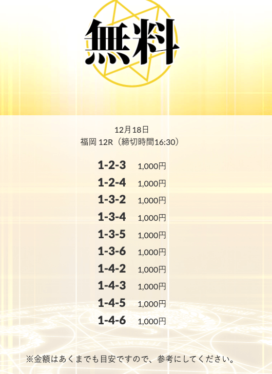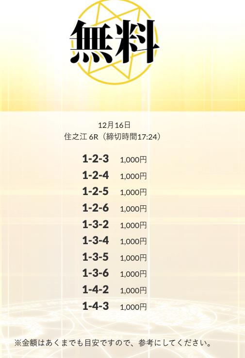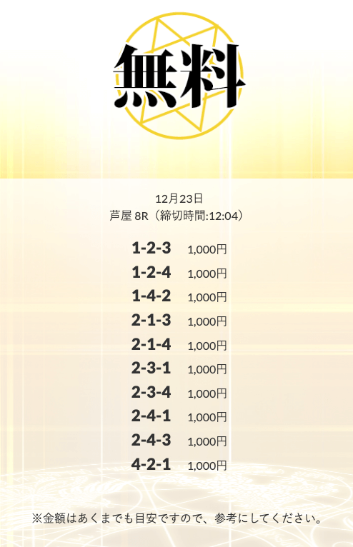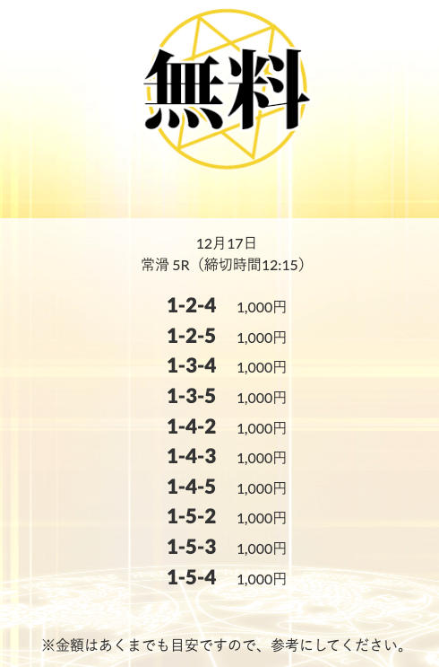 - 2025/12/24的中 無料予想で22,100円獲得2025/12/23的中 無料予想で28,400円獲得2025/12/23的中 無料予想で16,200円獲得2025/12/19的中 無料予想で14,400円獲得2025/12/19的中 無料予想で26,700円獲得2025/12/17的中 無料予想で14,900円獲得2025/12/17的中 無料予想で21,500円獲得2025/12/16的中 無料予想で24,500円獲得2025/12/12的中 無料予想で15,800円獲得2025/12/12的中 無料予想で13,400円獲得