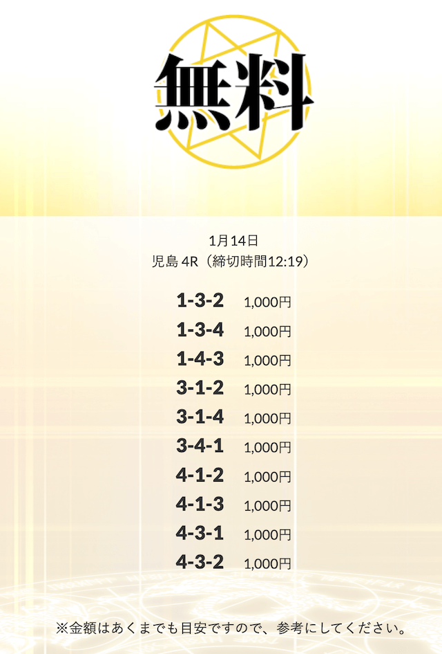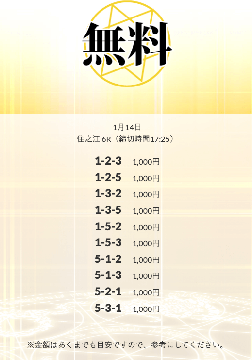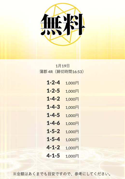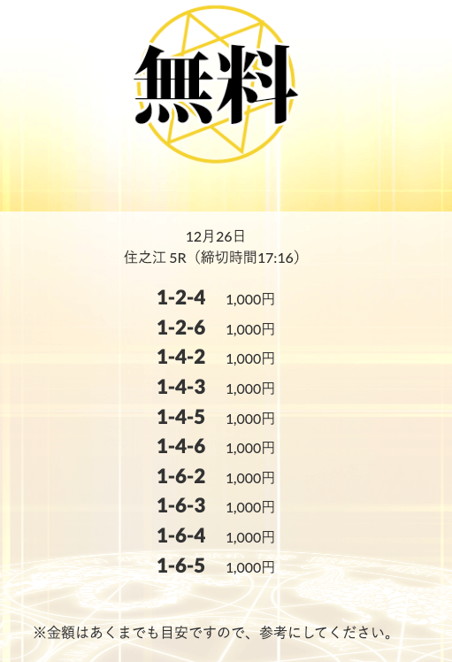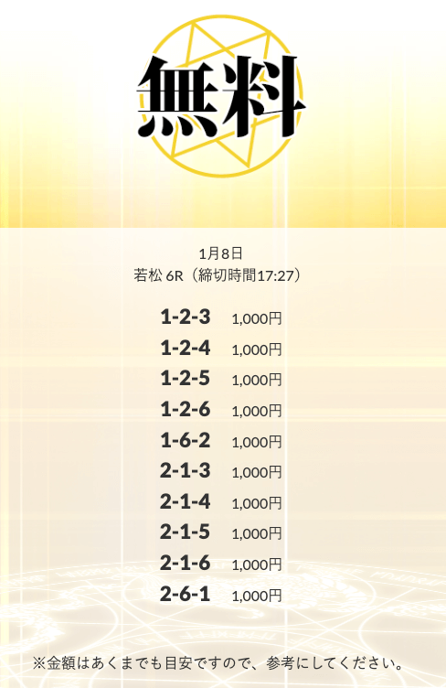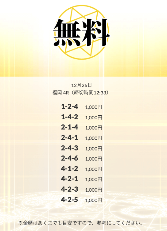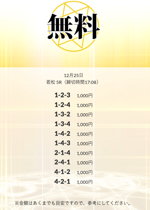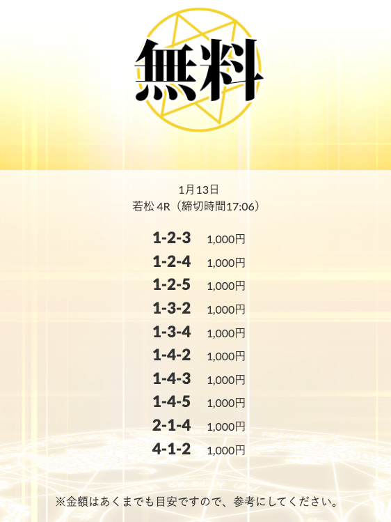 - 2026/01/14的中 無料予想で10,500円獲得2026/01/08的中 無料予想で14,000円獲得2026/01/06的中 無料予想で20,700円獲得2026/01/06的中 無料予想で14,100円獲得2026/01/02的中 無料予想で42,800円獲得2025/12/31的中 無料予想で28,300円獲得2025/12/30的中 無料予想で21,600円獲得2025/12/26的中 無料予想で14,200円獲得2025/12/26的中 無料予想で17,600円獲得2025/12/24的中 無料予想で22,100円獲得