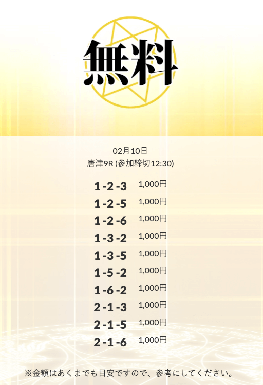 - 無料で的中 → 参加してプラス。 予想が感覚じゃなくて論理派。 分析好きなら相性いいと思う。投稿日:2026/02/03