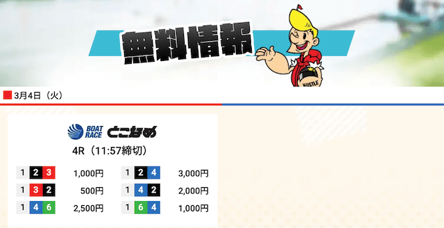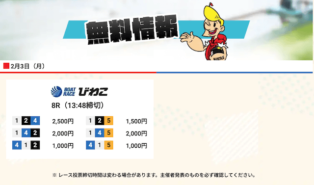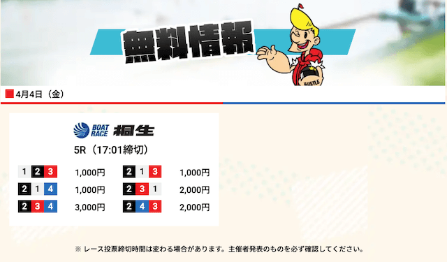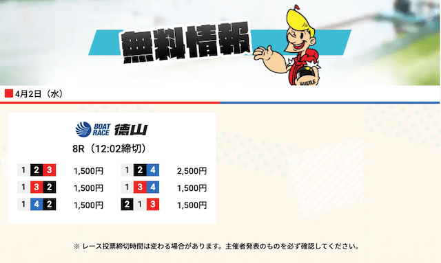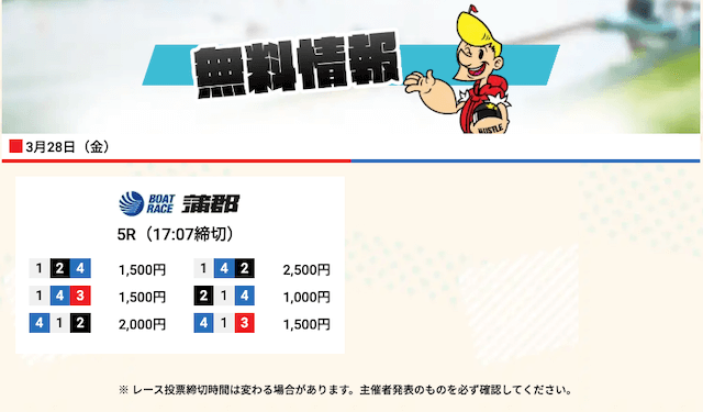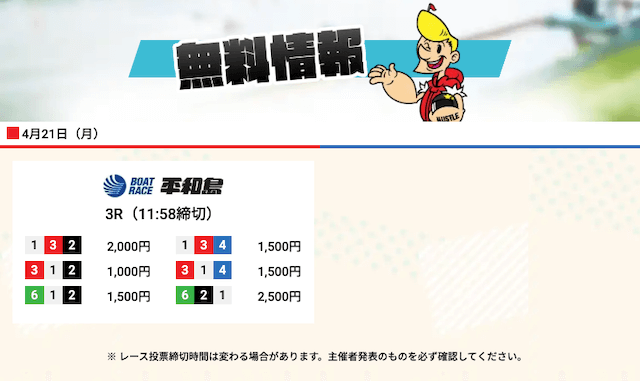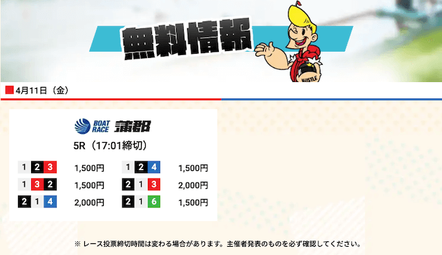 競艇ハッスルの無料予想の公開時間は11時・16時なんだけど、予想が公開されてから、レースの投票締切時間が30分を切っているケースがあるから注意してね!!通知は来るには来るけど、早めにチェックしておくべきだよ。