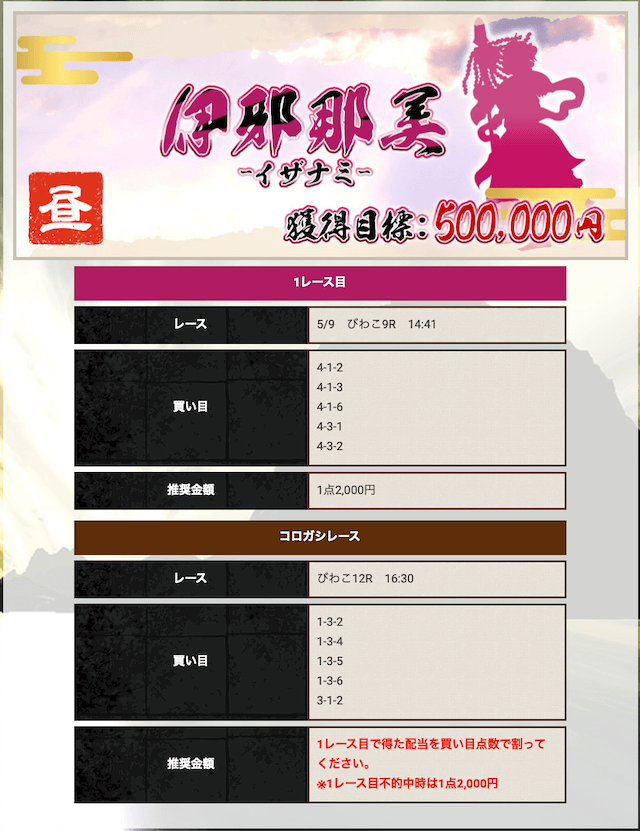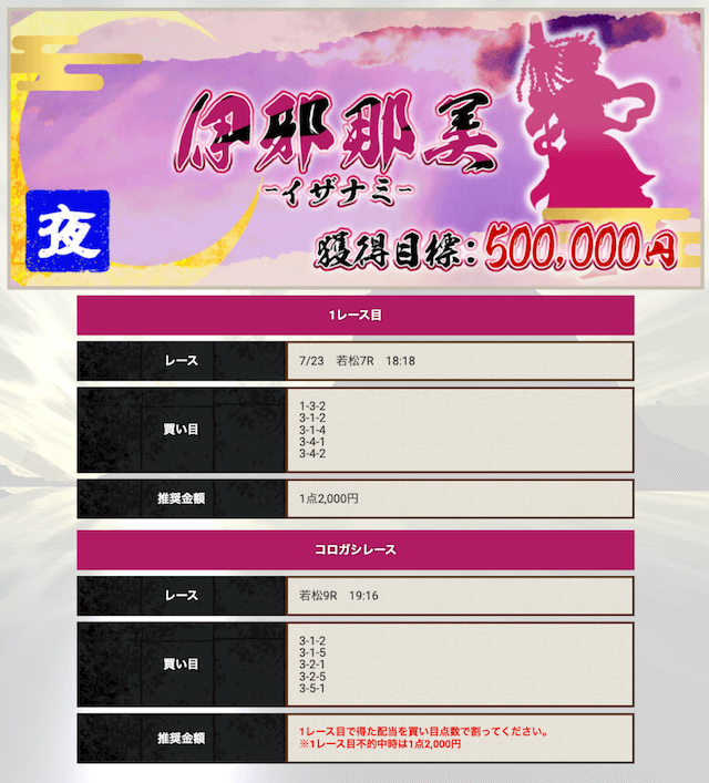 つまり、少ない軍資金で大金を稼ぐには「無料予想▶伊邪那美」が最適だということ。