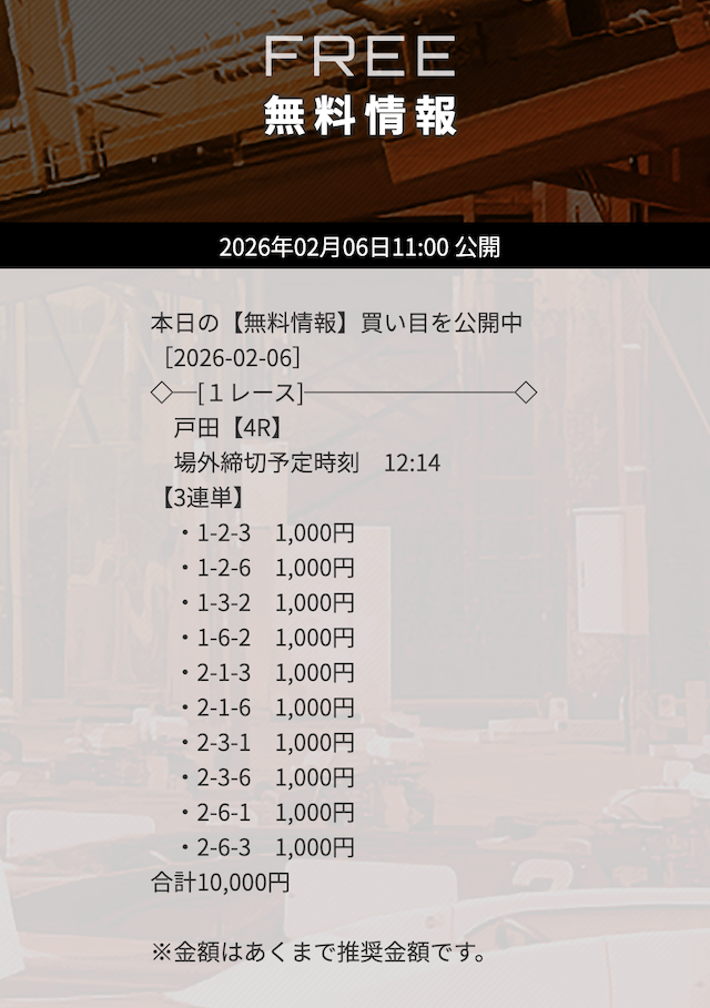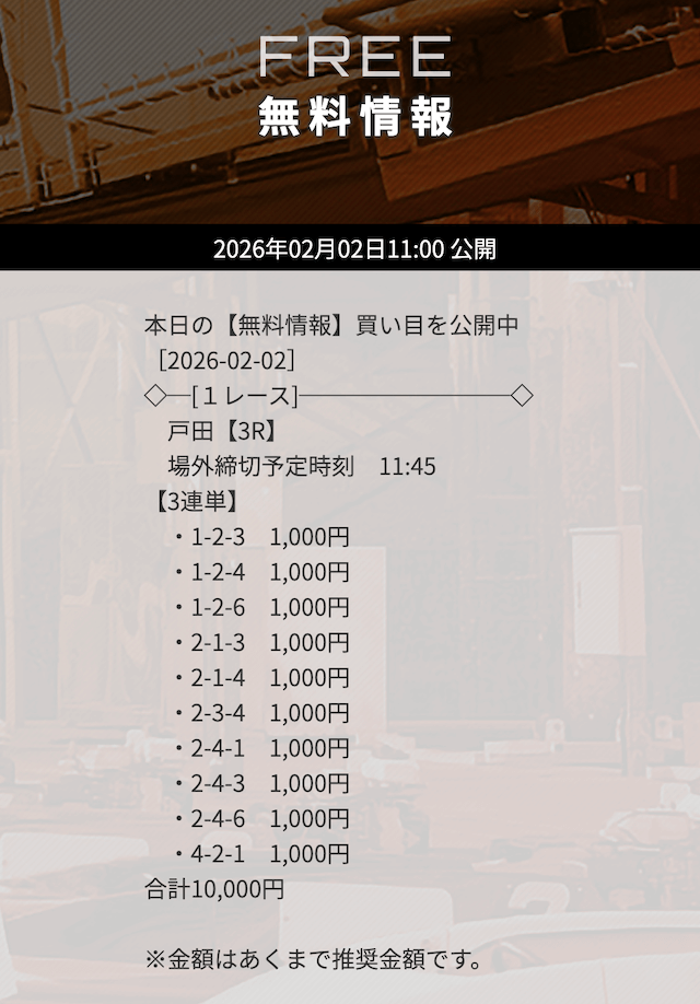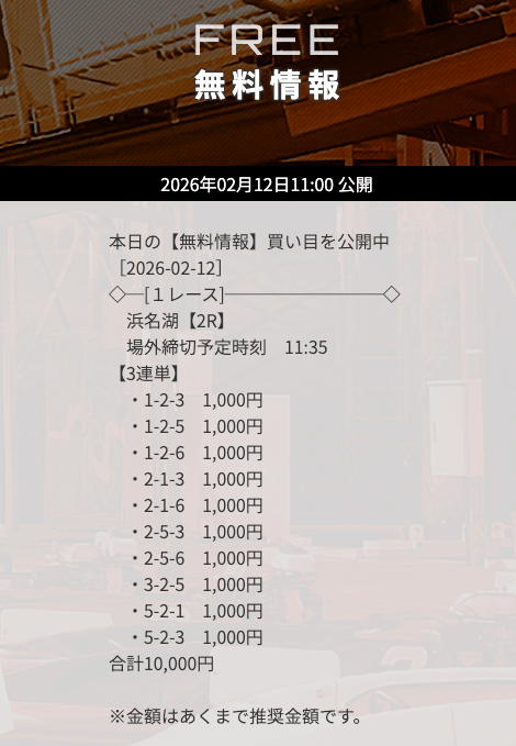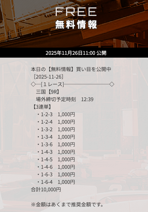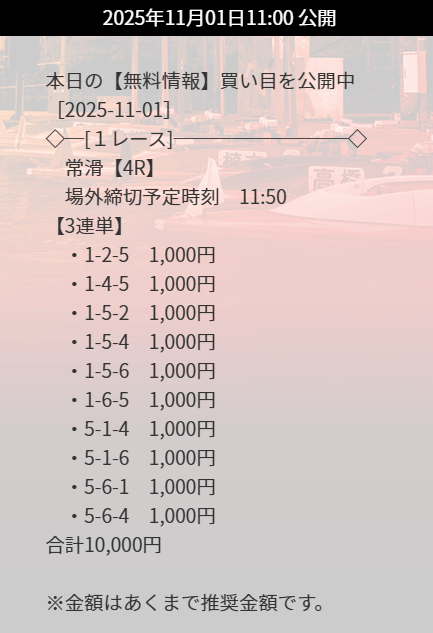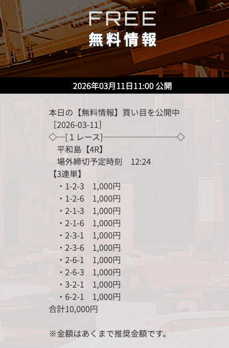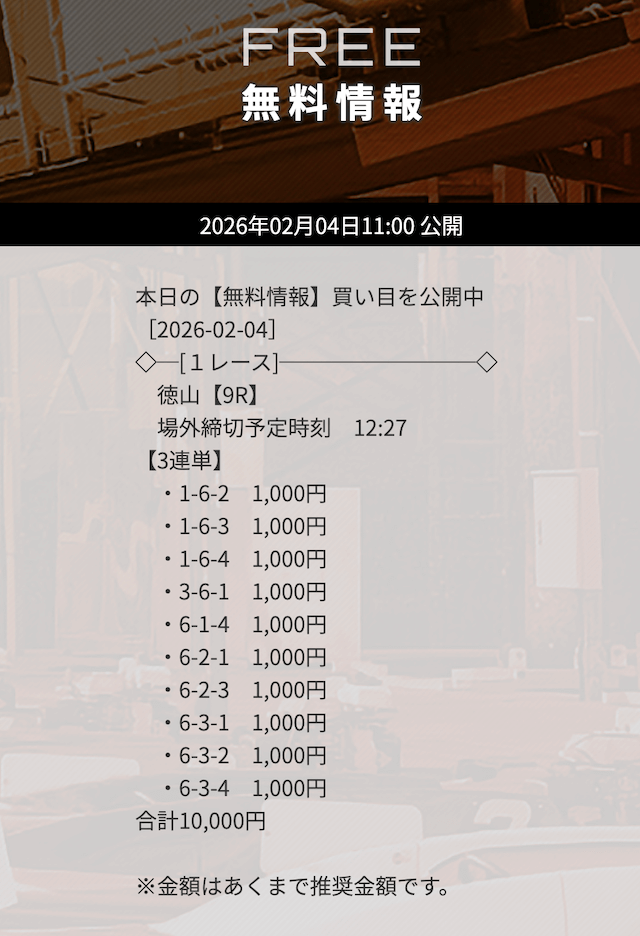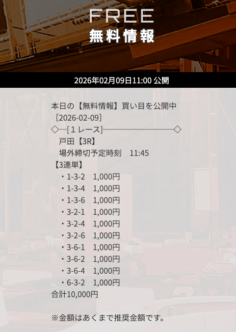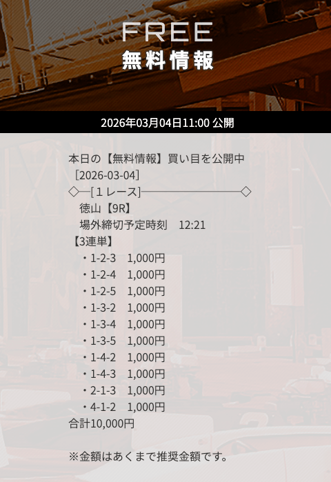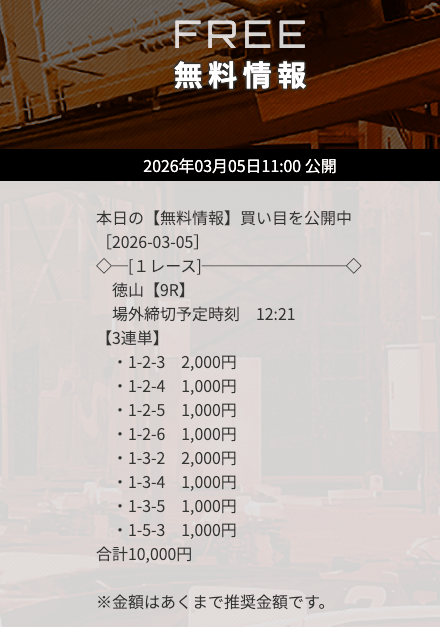 | 10/31 | 徳山9R | 的中 | 26,800円 |  |