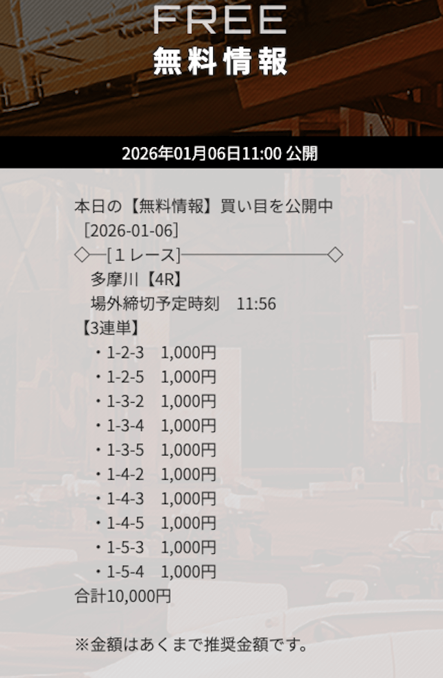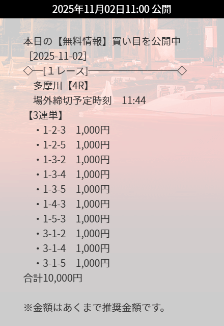 | 11/15 | 多摩川3R | 的中 | 12,600円 |  |