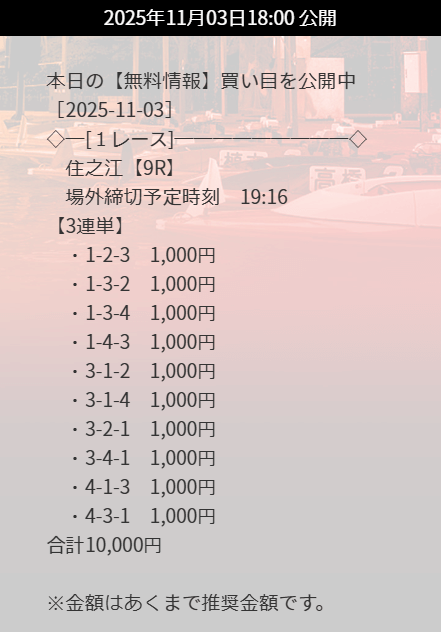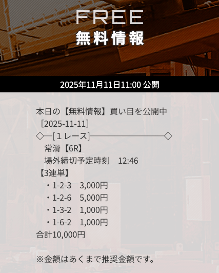 | 11/6 | 住之江8R | 的中 | 10,700円 |  |