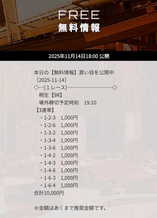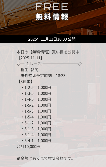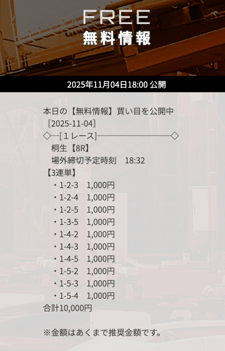 | 11/8 | 桐生8R | 不的中 | 0円 |  |