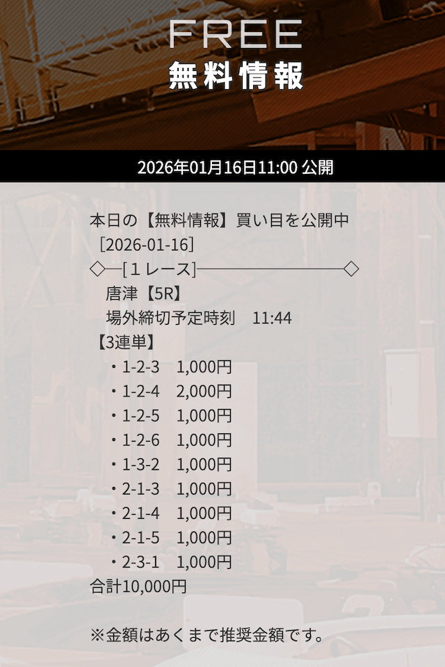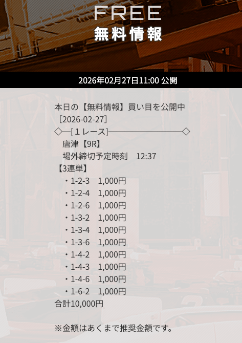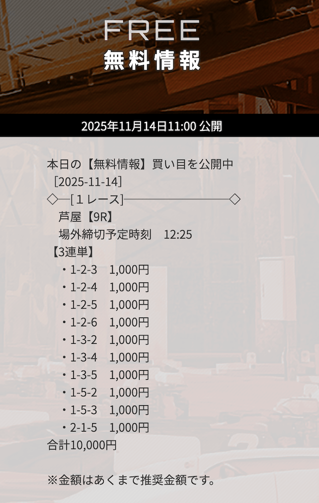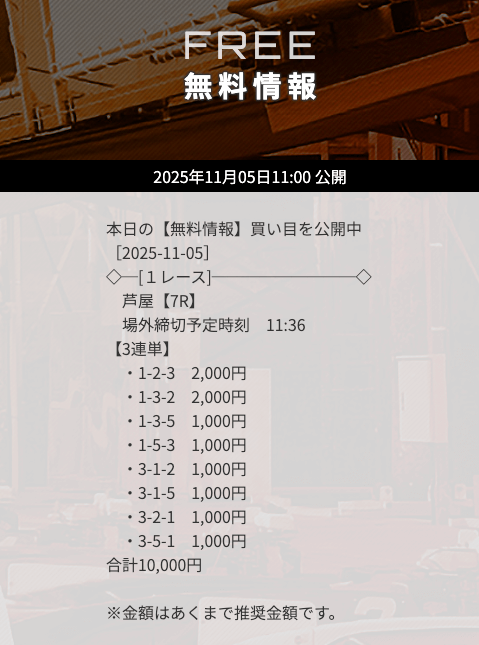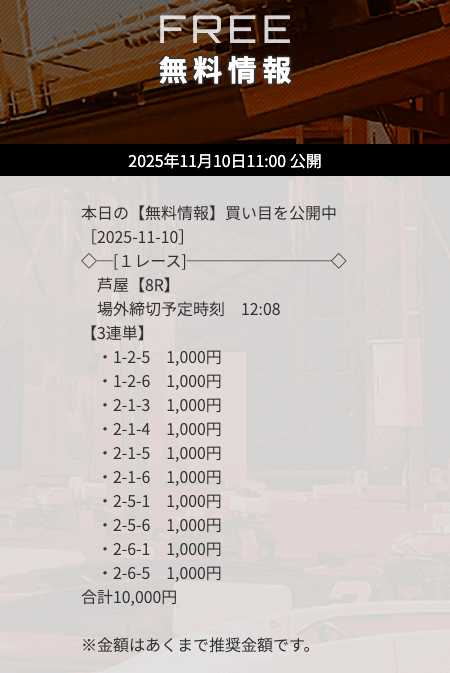 | 10/16 | 芦屋9R | 的中 | 16,800円 |  |