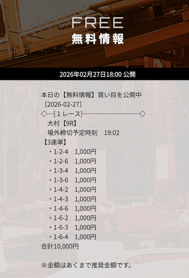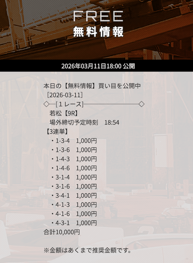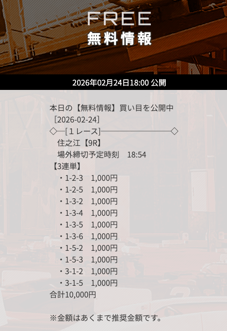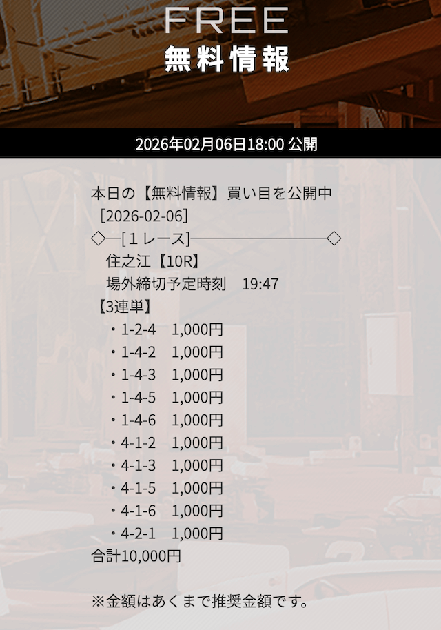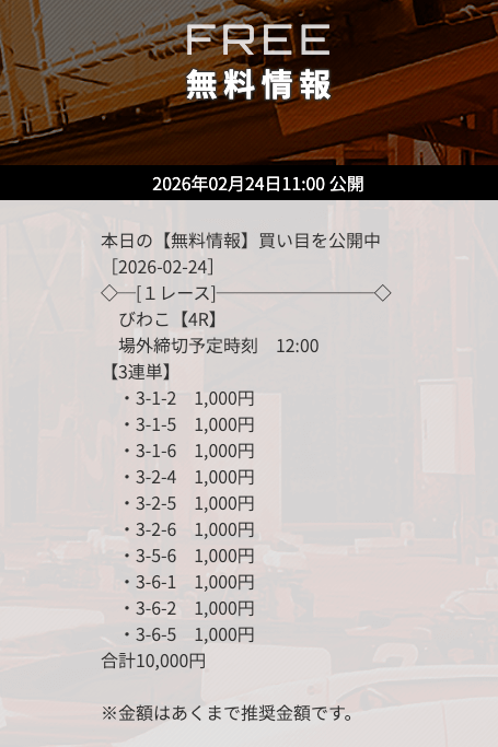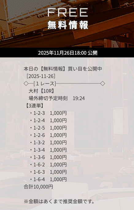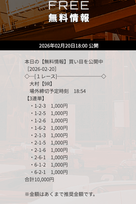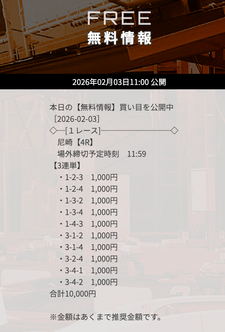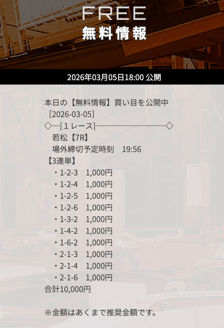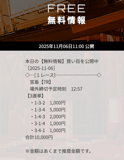 無料予想で3万円以上の高額払戻しを獲得した「次のレース」を狙うのも1つの手です。過去に何度も「高額払戻し▶連勝」というケースがありました。特にナイターのレースで的中した「