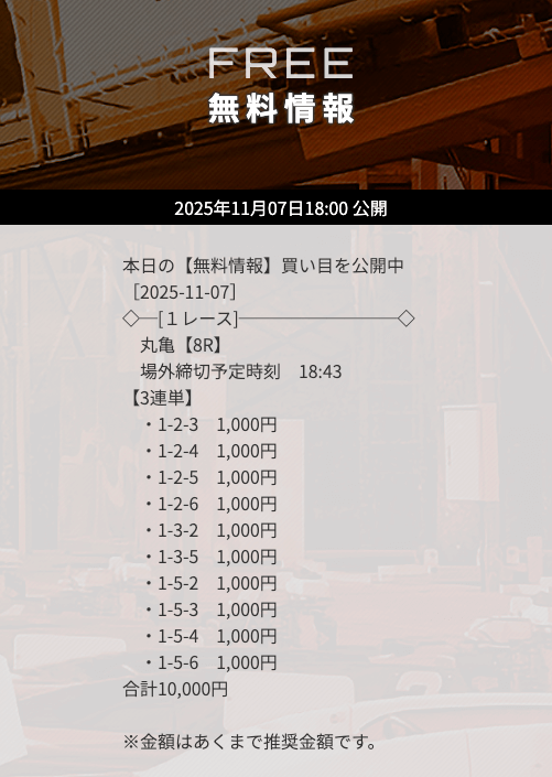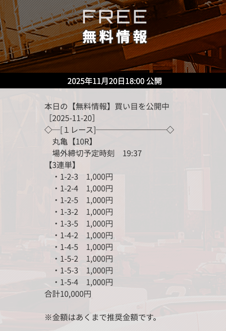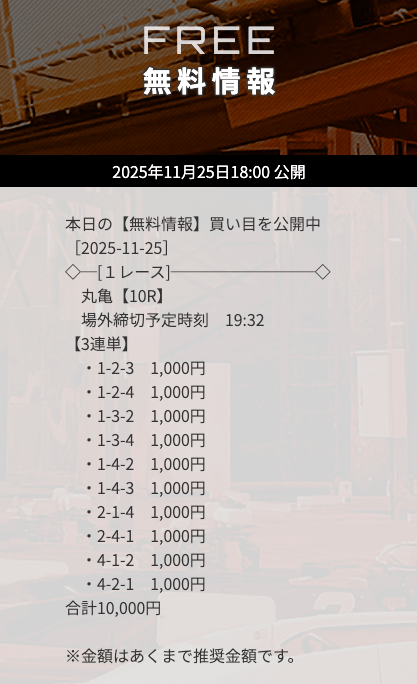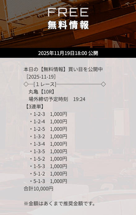 | 10/23 | 丸亀8R | 的中 | 10,200円 |  |