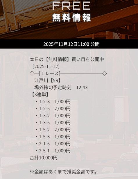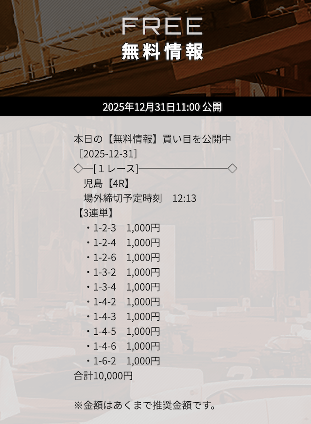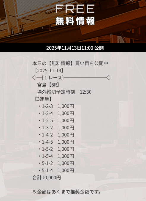 | 12/11 | 児島5R | 的中 | 13,800円 |  |
