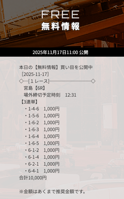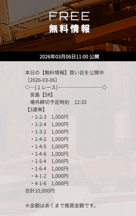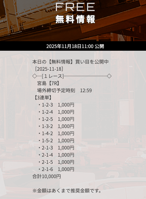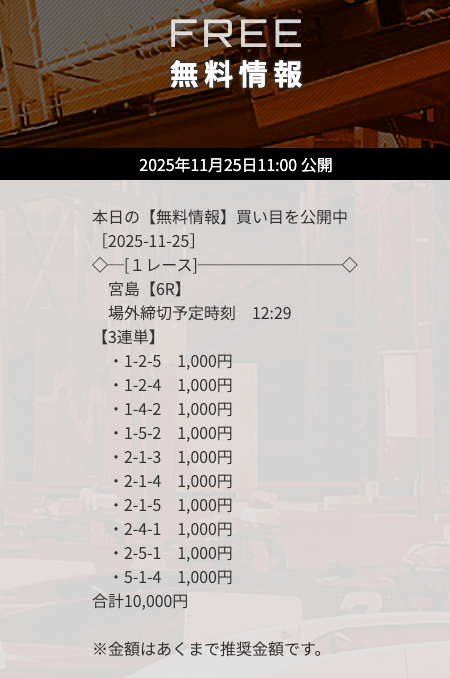 | 11/7 | 宮島5R | 的中 | 12,200円 |  |