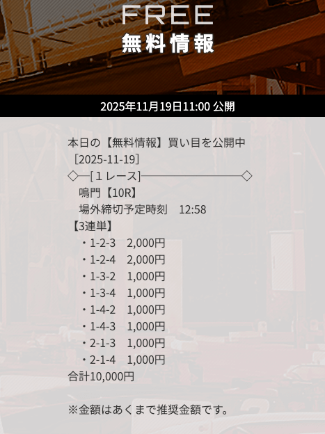 | 10/19 | 鳴門8R | 的中 | 34,500円 |  |