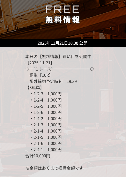 | 11/21 | 下関8R | 的中 | 24,400円 |  |