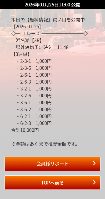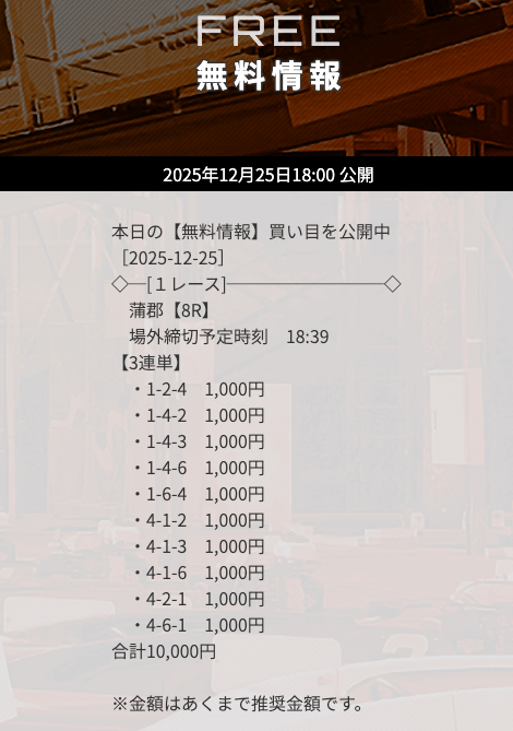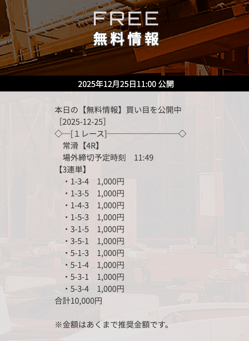 | 12/25 | 浜名湖6R | 的中 | 19,000円 |  |