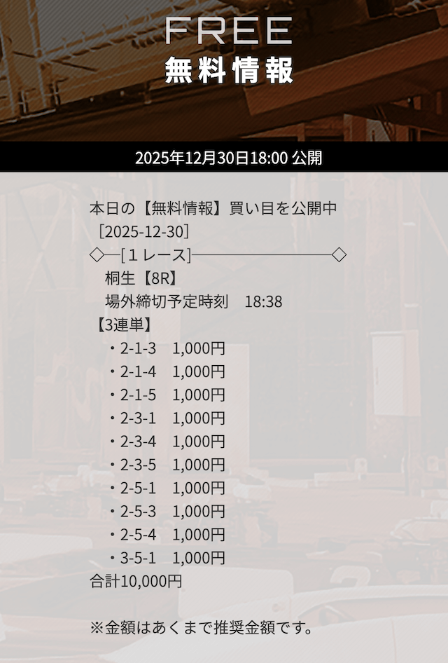 | 8/30 | 桐生10R | 的中 | 15,000円 |  |