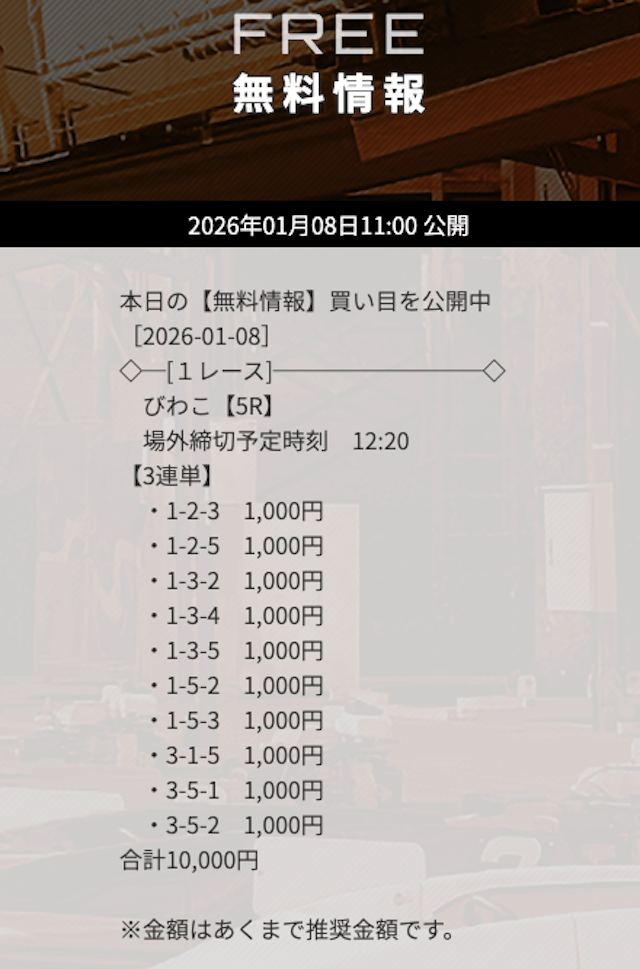 | 10/8 | びわこ5R | 的中 | 18,000円 |  |