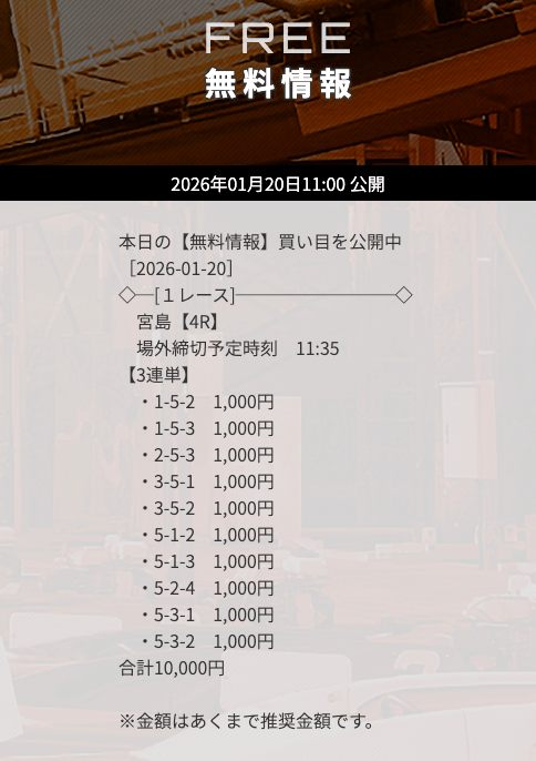| 12/20 | 宮島7R | 不的中 | 0円 |  |