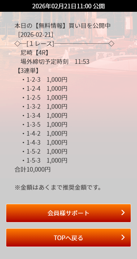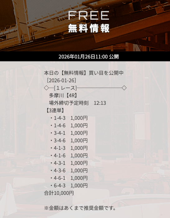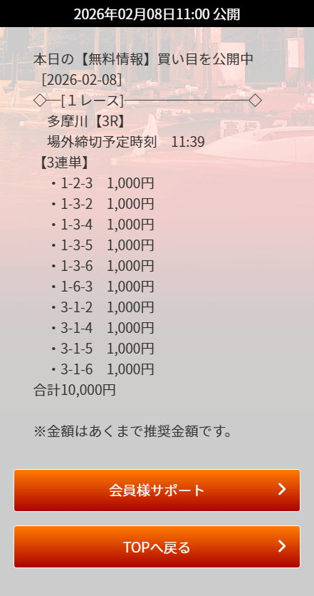 | 9/4 | 多摩川1R | 的中 | 21,400円 |  |