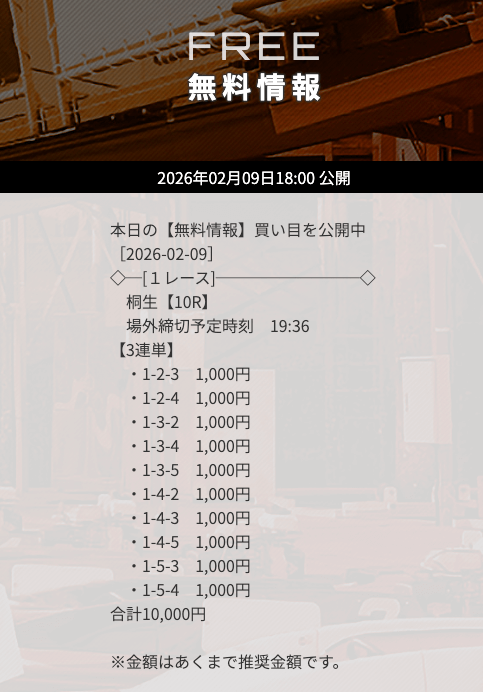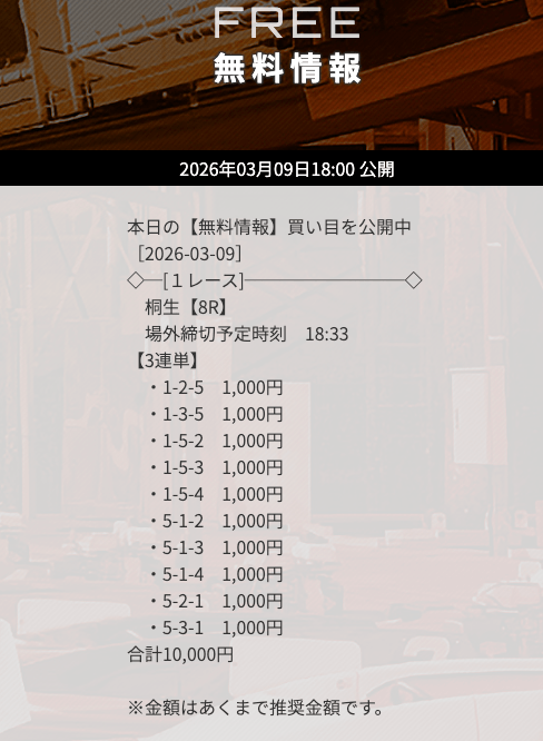 | 9/9 | 桐生8R | 不的中 | 0円 |  |