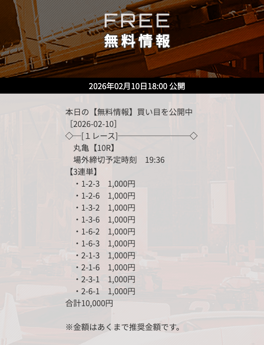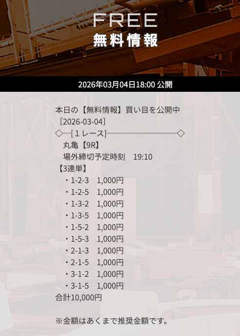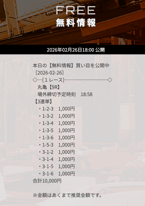 | 10/16 | 丸亀8R | 的中 | 10,400円 |  |