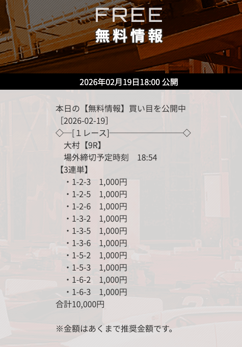 | 10/19 | 下関5R | 的中 | 17,700円 |  |