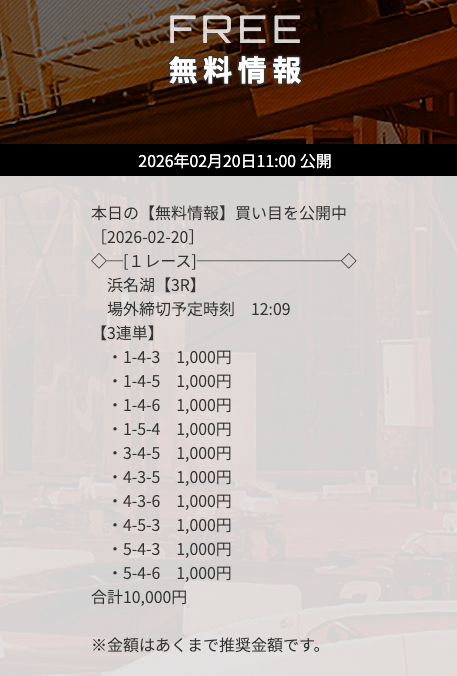 | 12/23 | 浜名湖6R | 的中 | 14,800円 |  |
