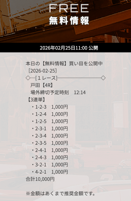 | 12/24 | 戸田3R | 的中 | 25,000円 |  |