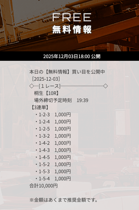 重賞一般も関係ない、むしろ攻めればワンチャン高配当みたいなレースに突っ込んでる感じするね。無料予想でこれだけ攻めて、不定期で高額払い戻し出してるし信頼感高いよ。