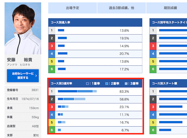 ①安藤はイン巧者で、1コースならA級並みの連対率だ(コース別連対率)。だが、展示を見りゃ②長野の舟足は仕上がってるし、ST勘もキレッキレだ。だから②アタマの展開は、普通にあり得るし⋯正直、不安が拭えねぇな。