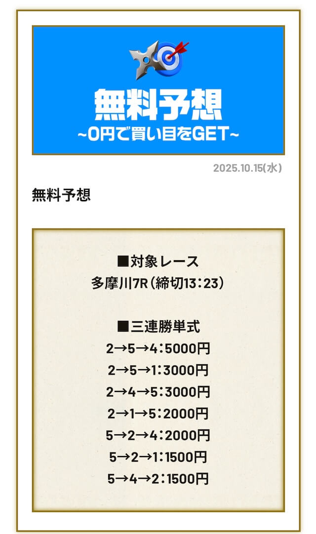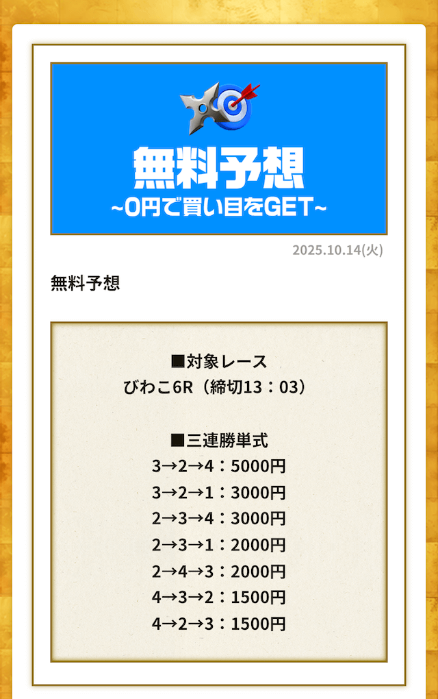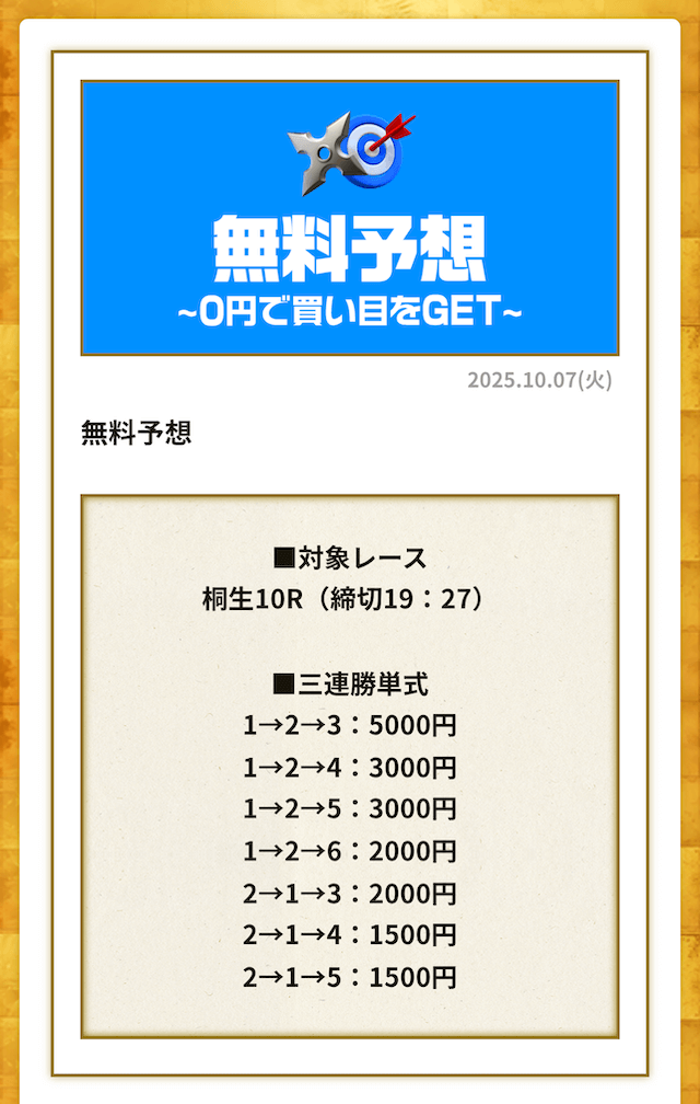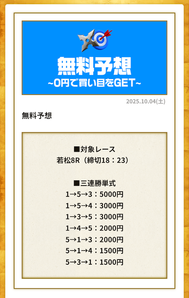 - 2025/10/15的中 無料予想で33,800円獲得2025/10/13的中 無料予想で61,200円獲得2025/10/12的中 無料予想で116,500円獲得2025/10/11的中 無料予想で42,000円獲得2025/10/11的中 無料予想で49,500円獲得2025/10/10的中 無料予想で59,000円獲得2025/10/09的中 無料予想で43,000円獲得2025/10/09的中 無料予想で54,500円獲得2025/10/08的中 無料予想で37,000円獲得2025/10/07的中 無料予想で66,000円獲得