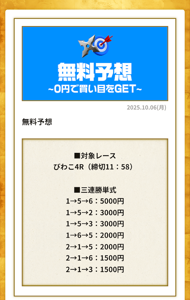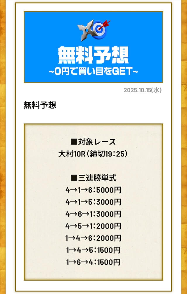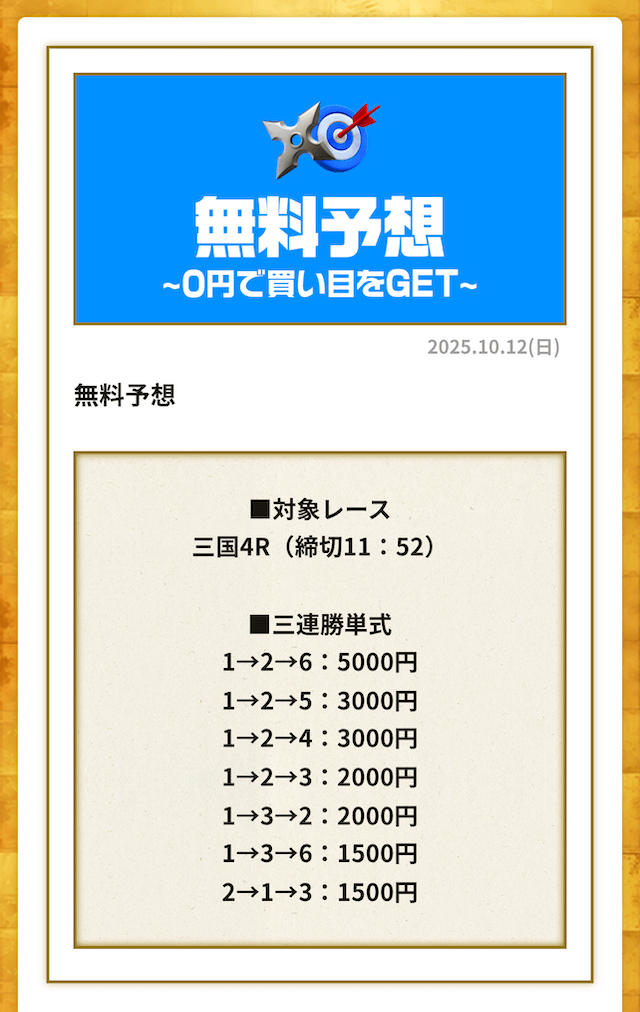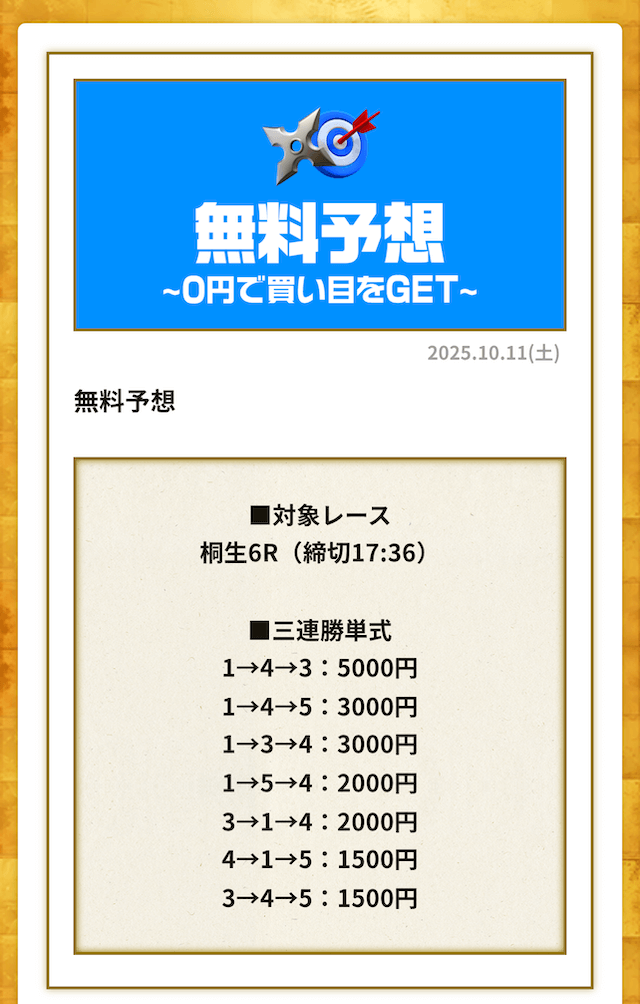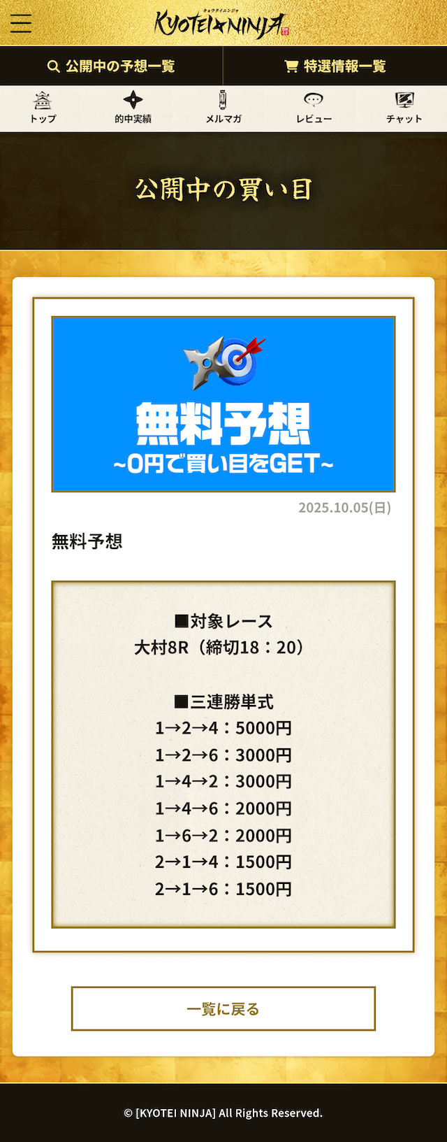 KYOUTEININJAの無料予想はとにかく予想精度が高い。的中率と回収率のバランスが非常に良く、短期的にも長期的にも結果を残せるのが魅力ですね。精神的に楽に続けられるのが助かる。投稿日:2025/10/14