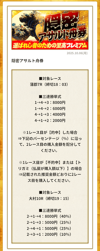 2025/10/6 隠密アサルト舟券 情報料金+舟券代 184,000円+40,000円 |