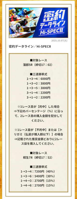 2025/10/7 密約データライン/Hi-SPECⅡ 情報料金+舟券代 29,500円+36,000円 |