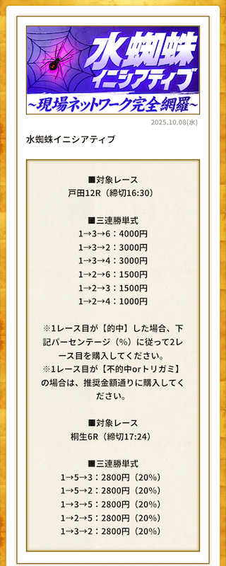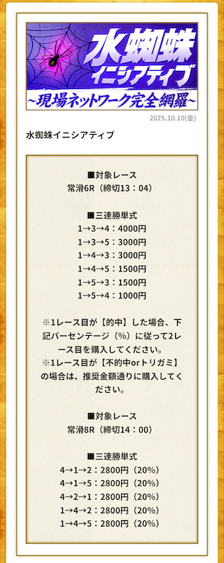 2025/10/10 水蜘蛛イニシアティブ 情報料金+舟券代 26,000円+28,000円 |