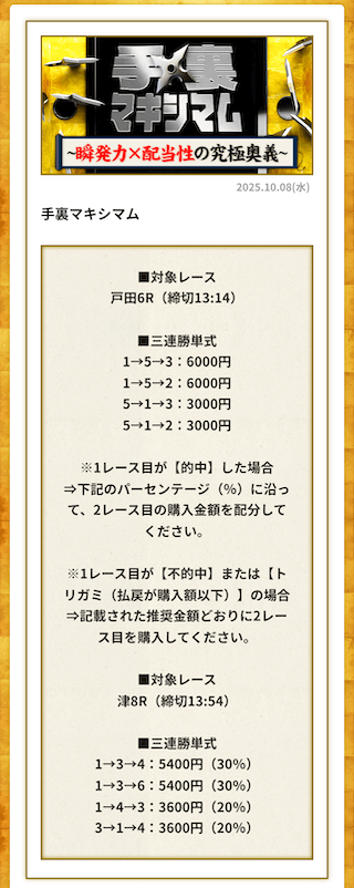 2025/10/8 手裏マキシマム 情報料金+舟券代 98,000円+36,000円 |