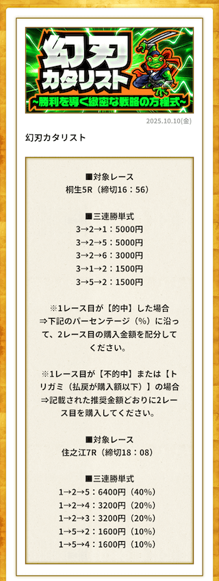 2025/10/10 幻刃カタリスト 情報料金+舟券代 45,000円+16,000円 |