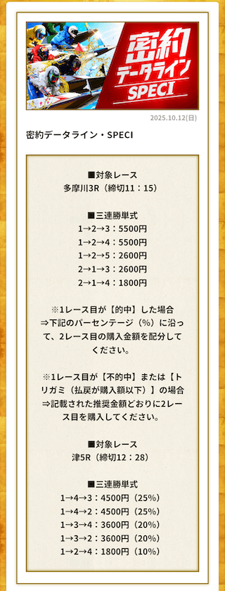 2025/10/12 密約データライン・SPECⅠ 情報料金+舟券代 24,500円+36,000円 |