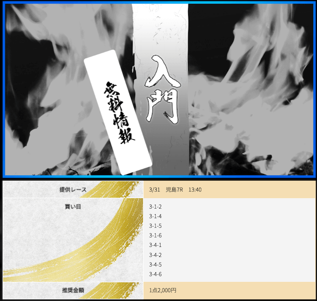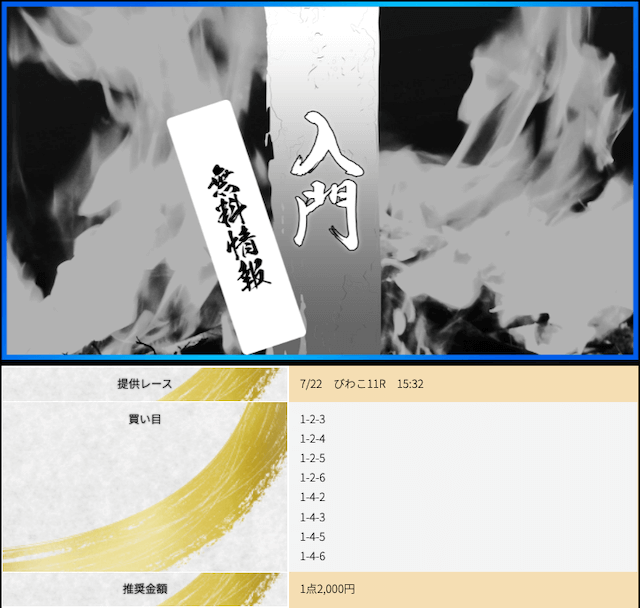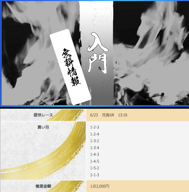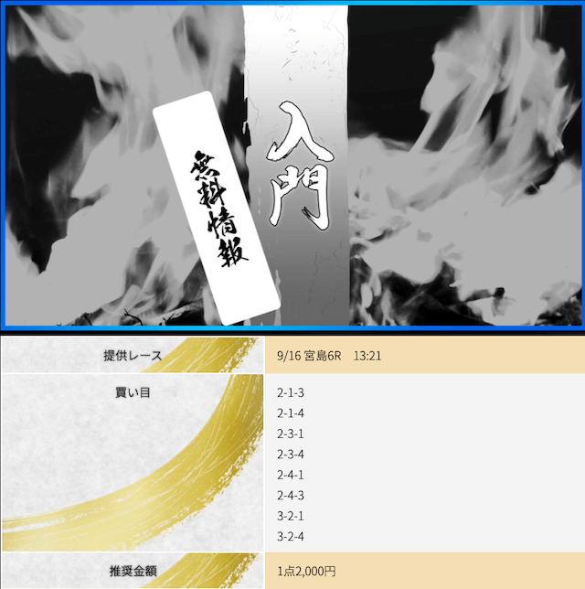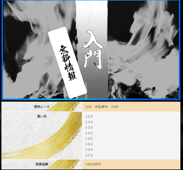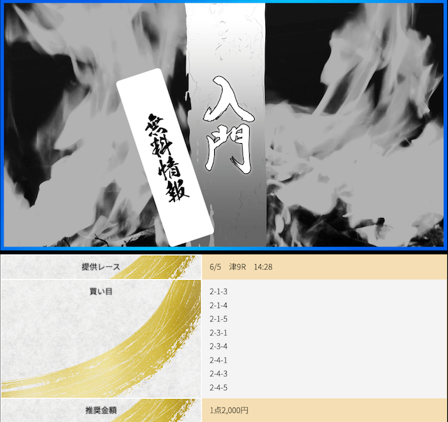 - プラン名大御所情報料金2000pt提供レース2レースコロガシ券種3連単5点目標金額200万円