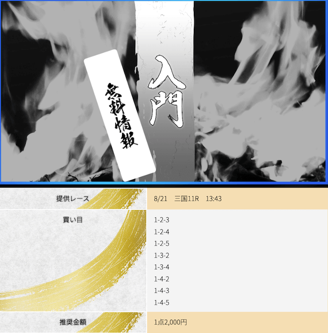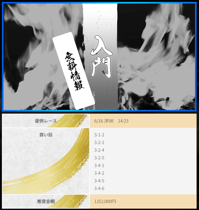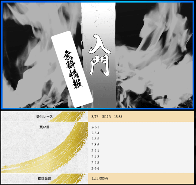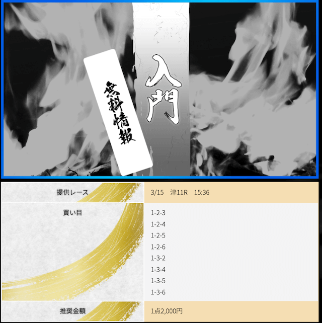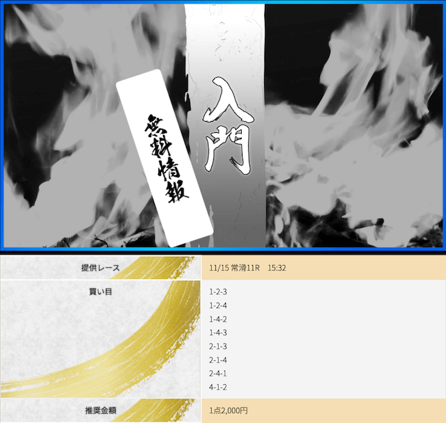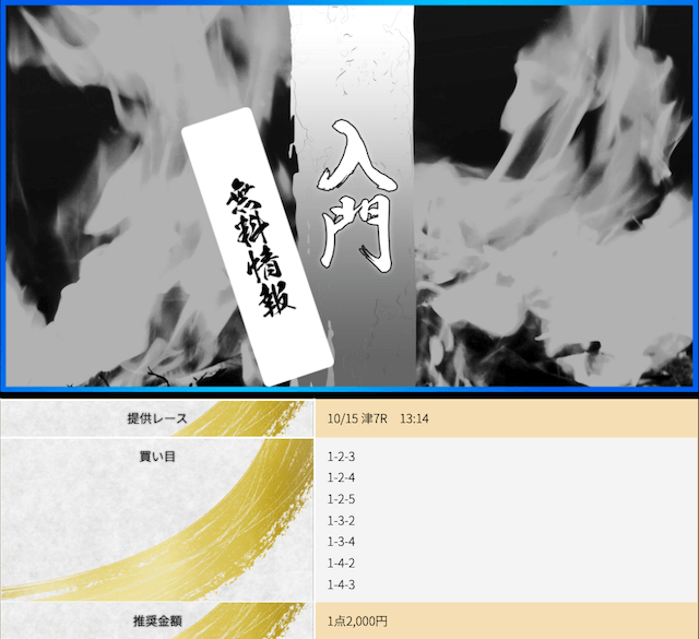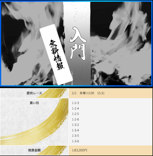 - プラン名道場破り情報料金1500pt提供レース2レースコロガシ券種3連単5点目標金額150万円