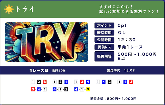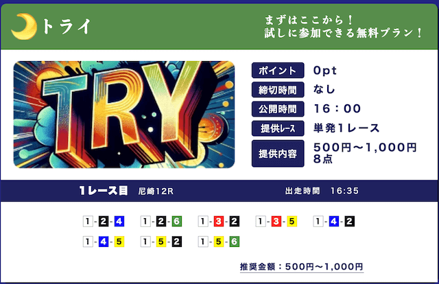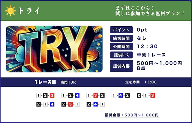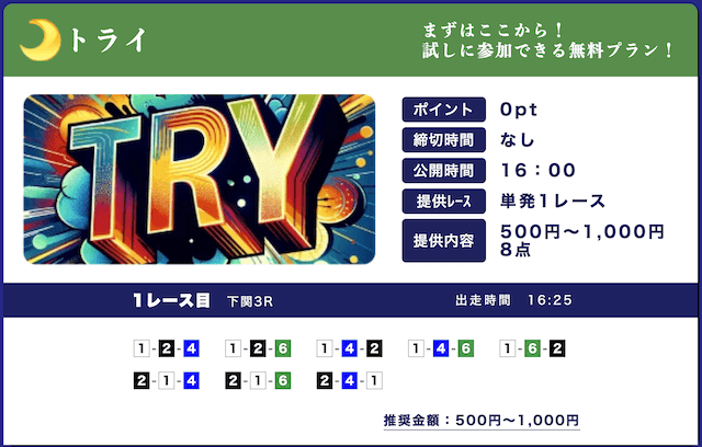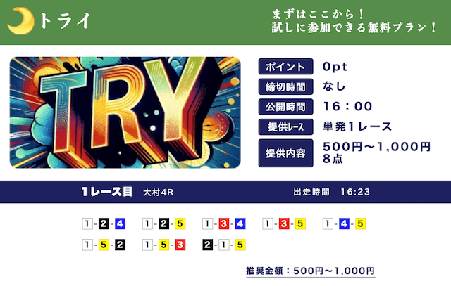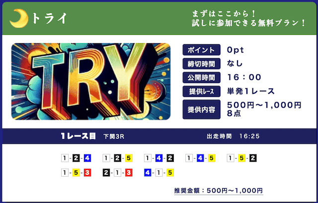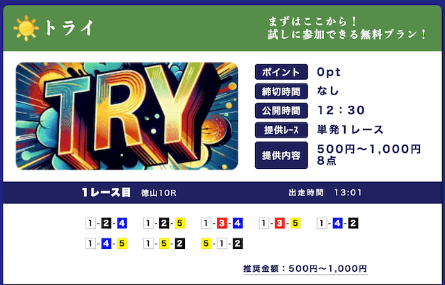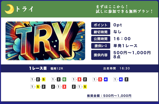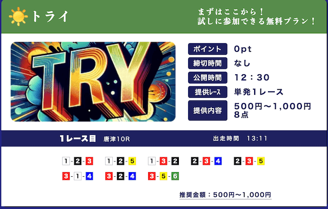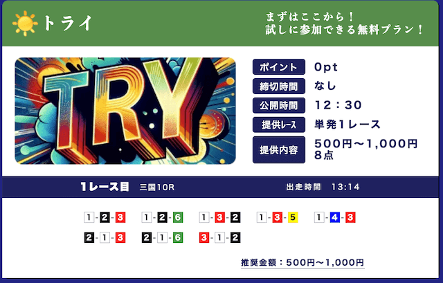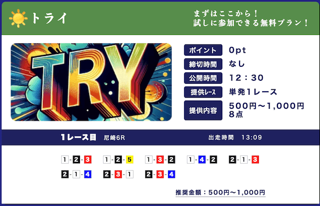 - 低リスクで試せる無料予想が入口になって、自然と有料プランに移行できたのが良かったです。しかも有料予想も結構安いし、無料予想の精度を見る限り、そこまでリスクを感じなかったな。初心者の方はオススメです。投稿日:2025/09/15
