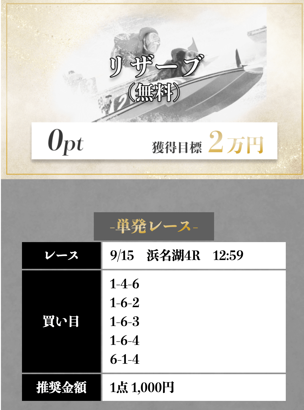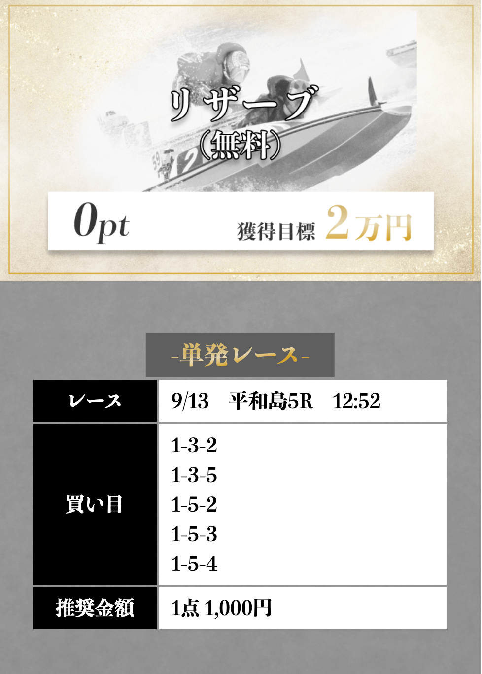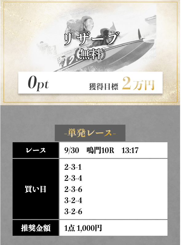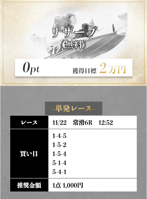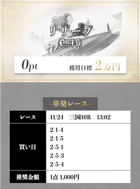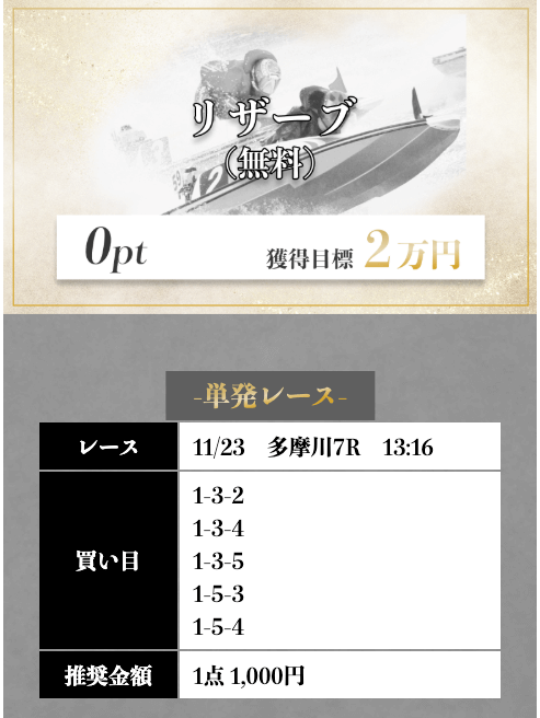 | 2025/3/18 1つ星 情報料金+舟券代 100,000円+20,000円 |