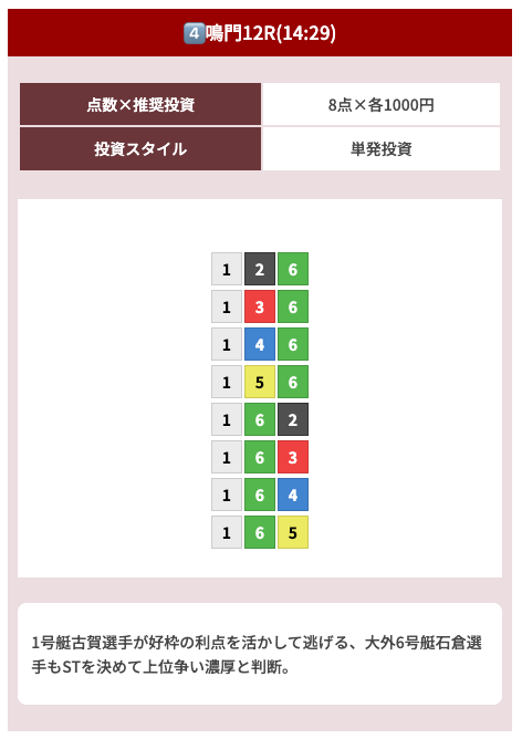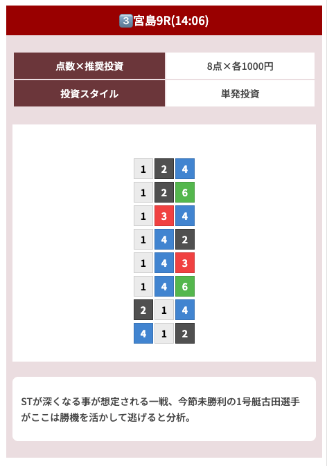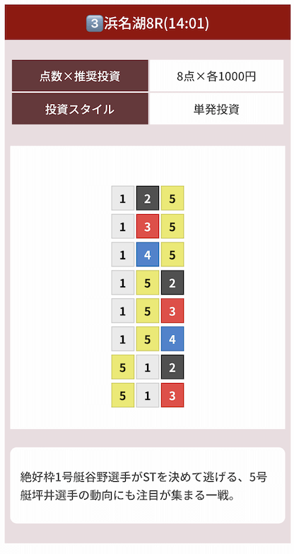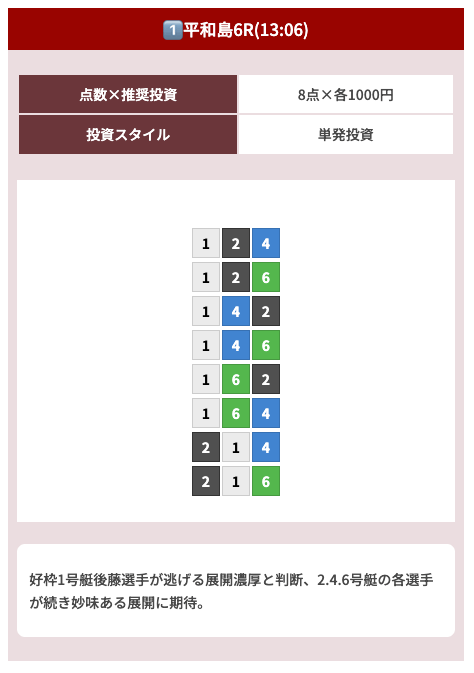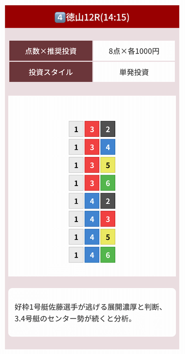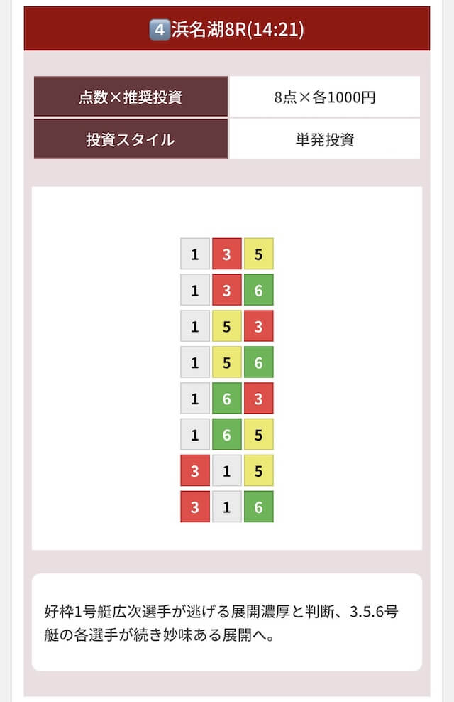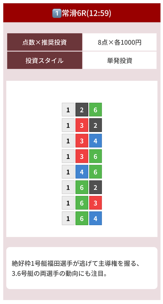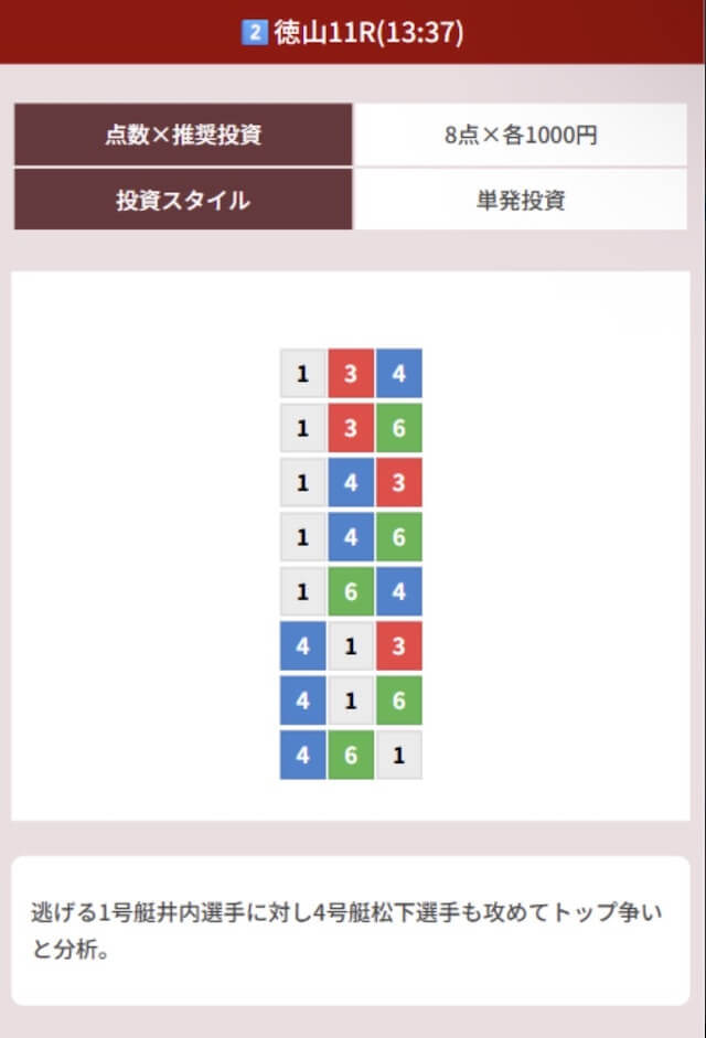 他の予想サイトではありえないほど、無料予想の内容が本気で作り込まれてる。鉄板レースを選びながらも1号艇を1着に固定せずに、様々な展開を押さえる。その根拠までしっかりと明記されているから信頼できる。明日は有料予想にも挑戦してみたいと思っています。