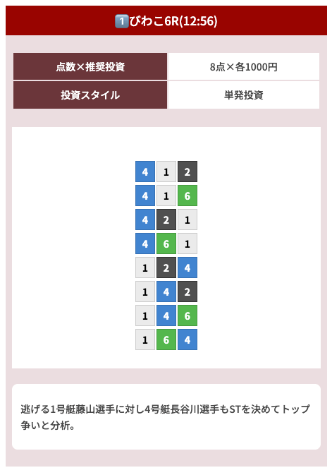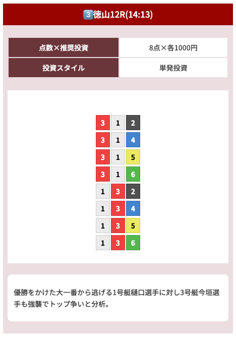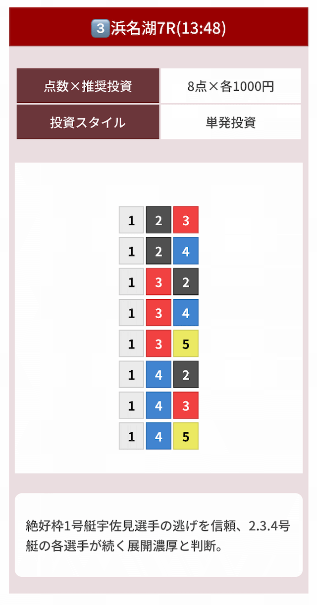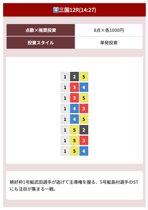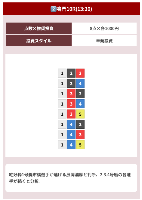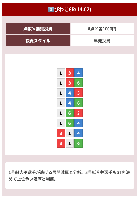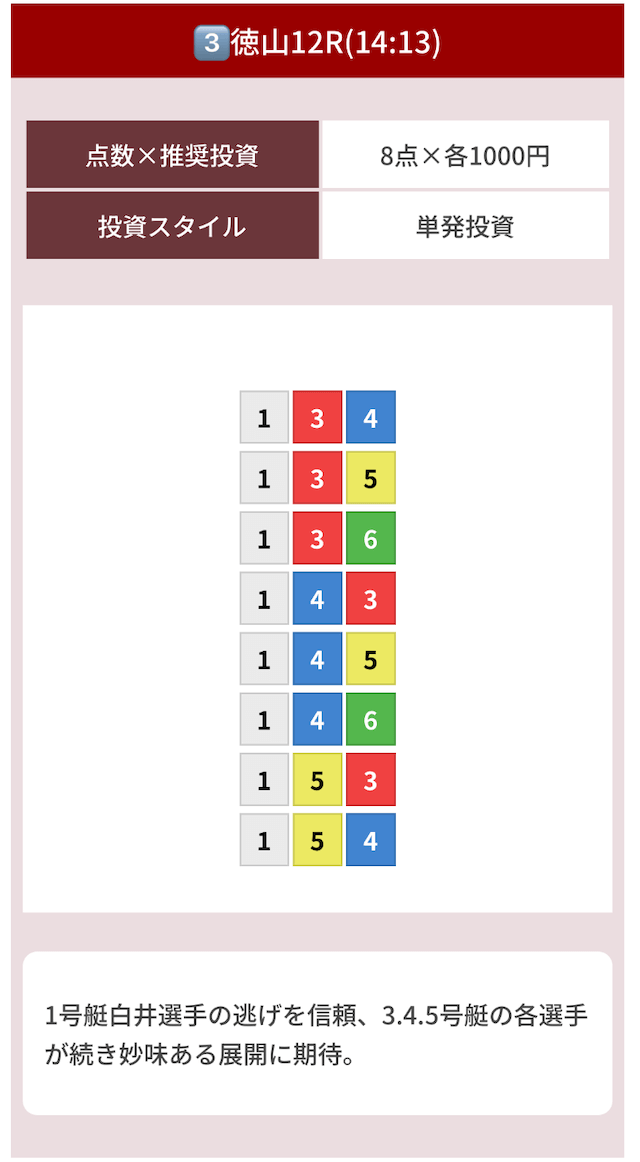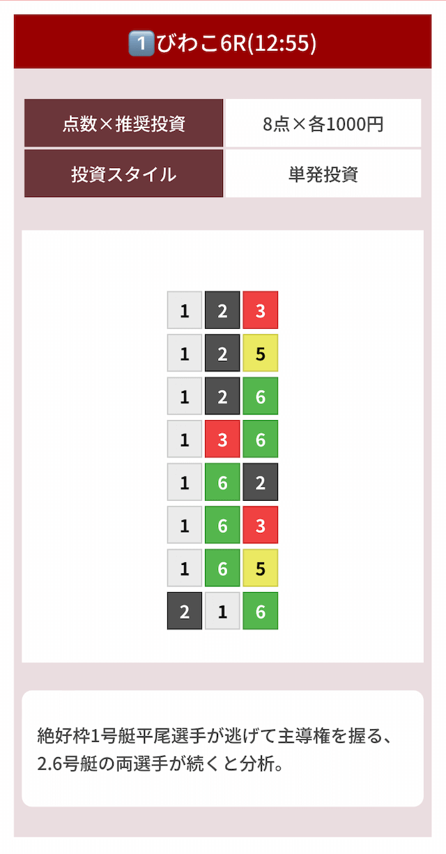 他の予想サイトではありえないほど、無料予想の内容が本気で作り込まれてる。鉄板レースを選びながらも1号艇を1着に固定せずに、様々な展開を押さえる。その根拠までしっかりと明記されているから信頼できる。明日は有料予想にも挑戦してみたいと思っています。