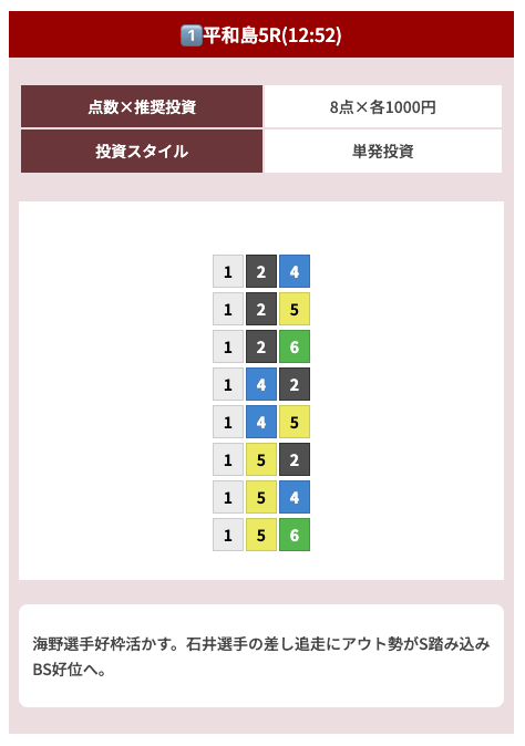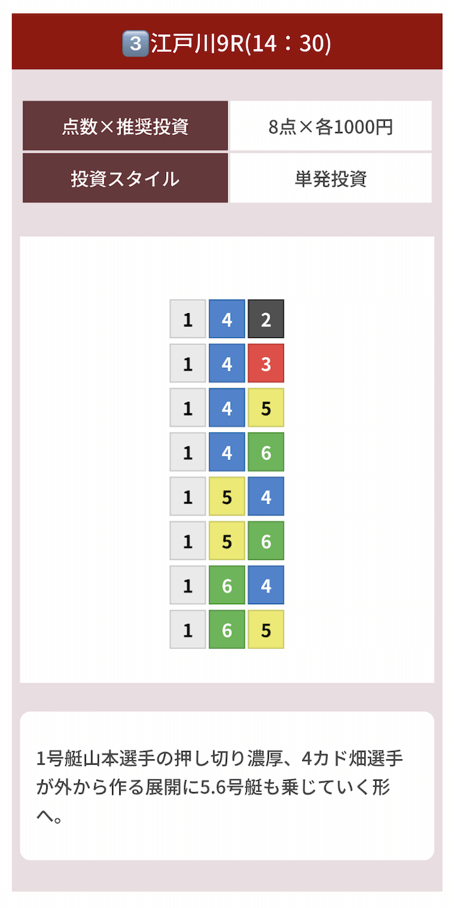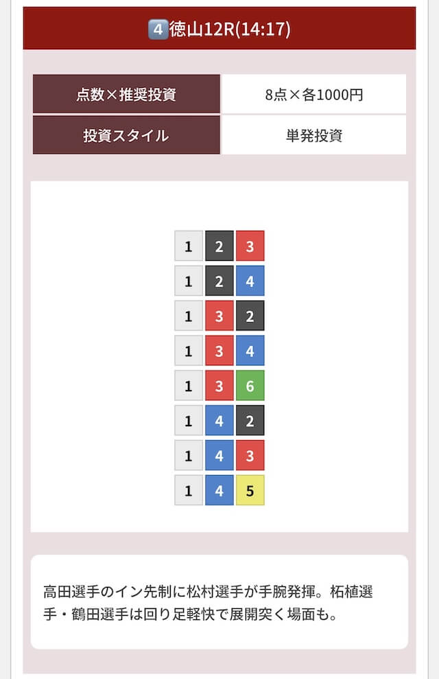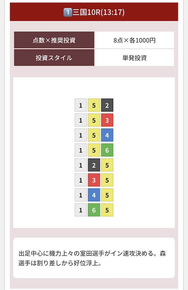 無料予想の買い目の下に見解が書かれているのが嬉しいな〜。予想に参加せずとも、プロの見解・思惑が分かるので、閲覧するだけでも非常に勉強になる。
