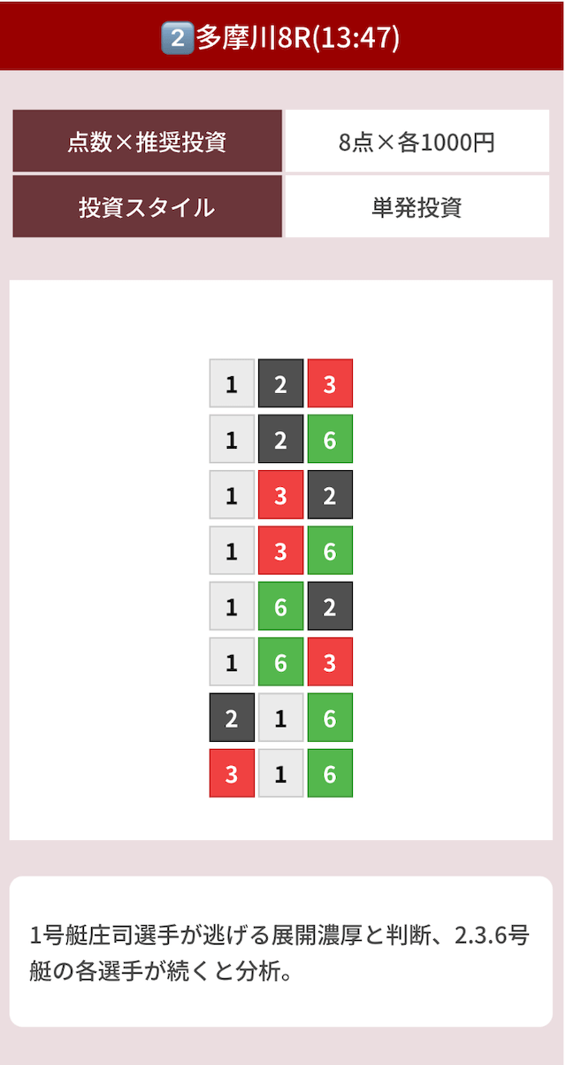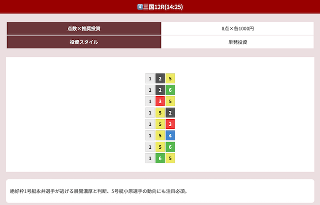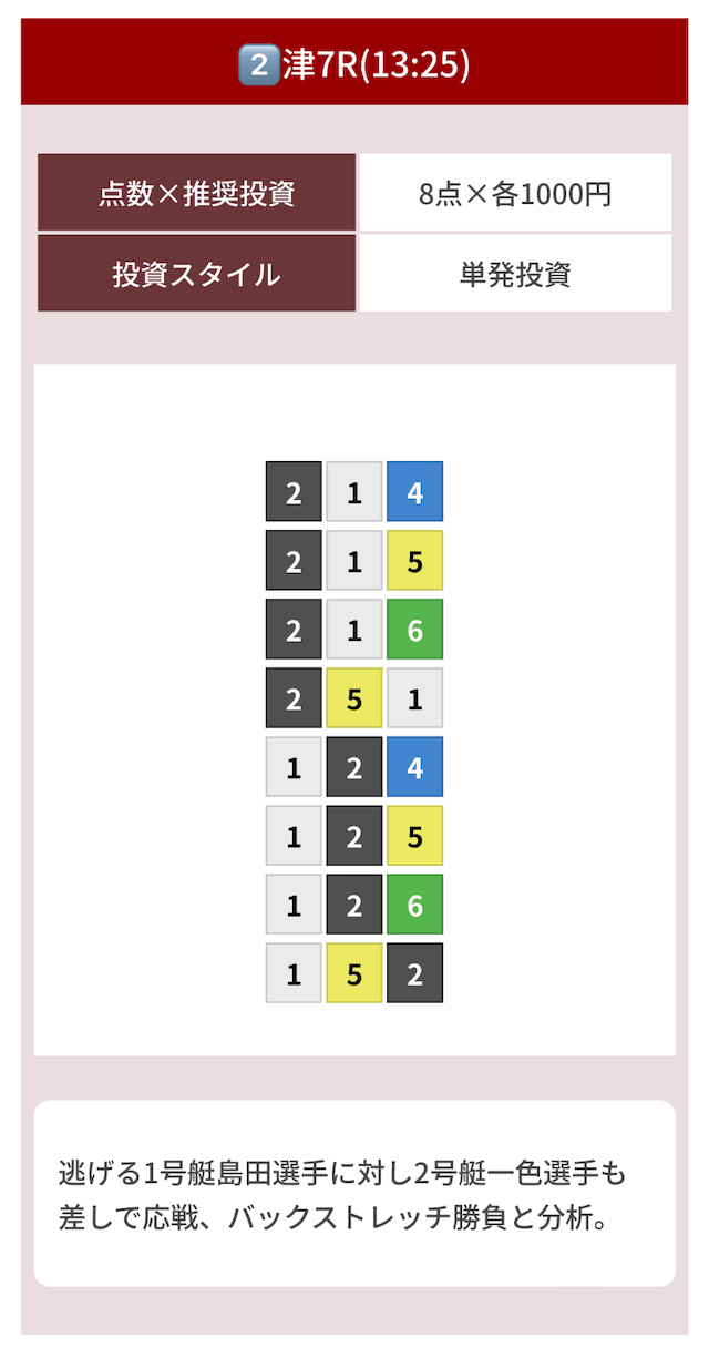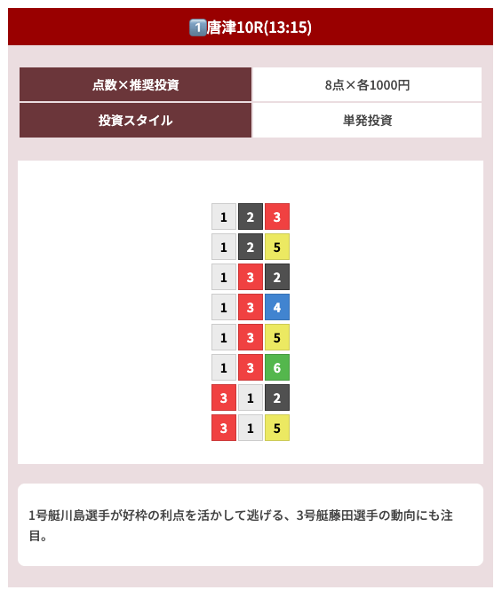 無料予想参加勢一度的中したら、その流れで3日連続で勝ち越し。流れに乗れる感じが良い。投稿日:2025/08/15