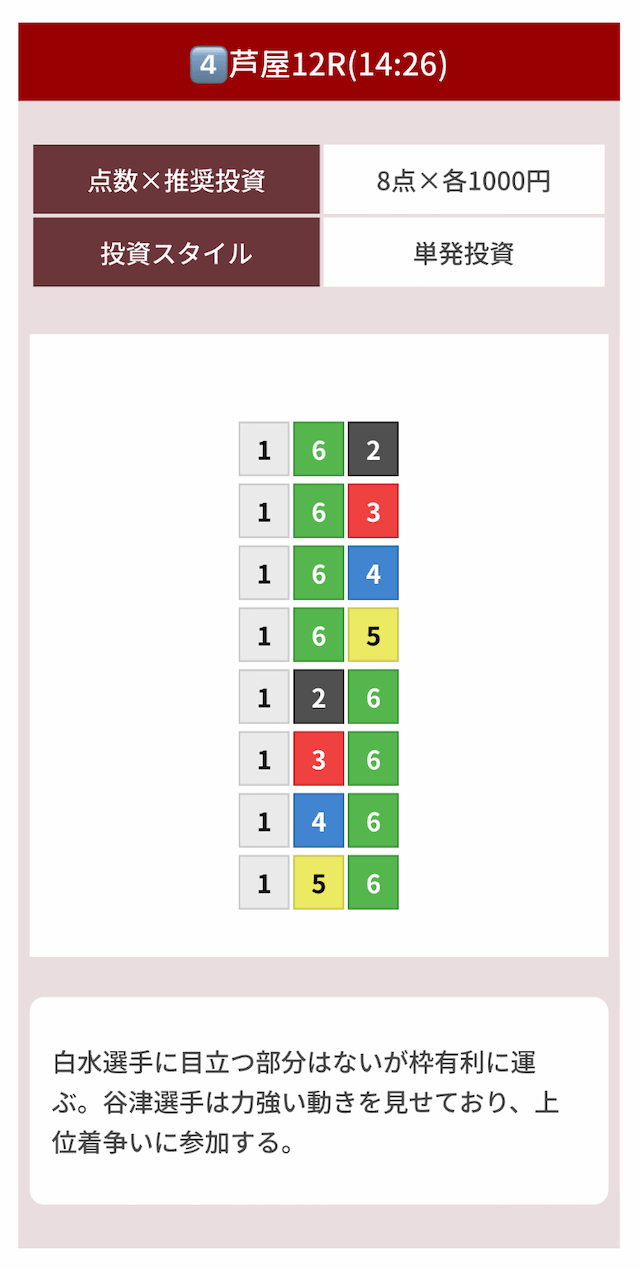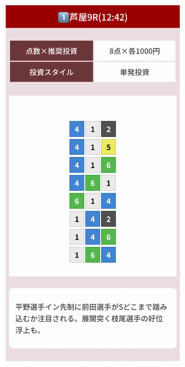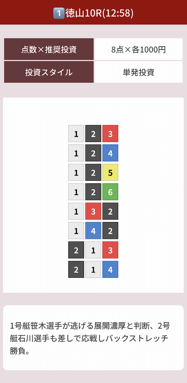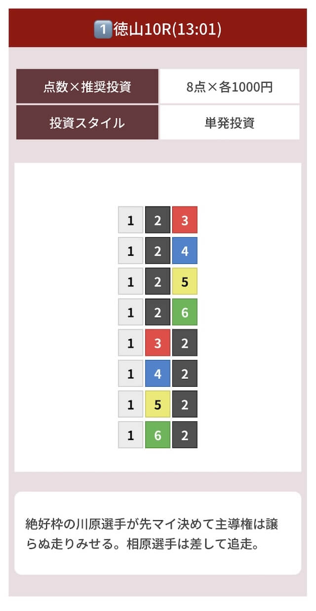 匿名1日4レースの無料予想はマジでありがたい。朝・昼・夕・夜で自分の空き時間に合わせて楽しめる。投稿日:2025/08/21