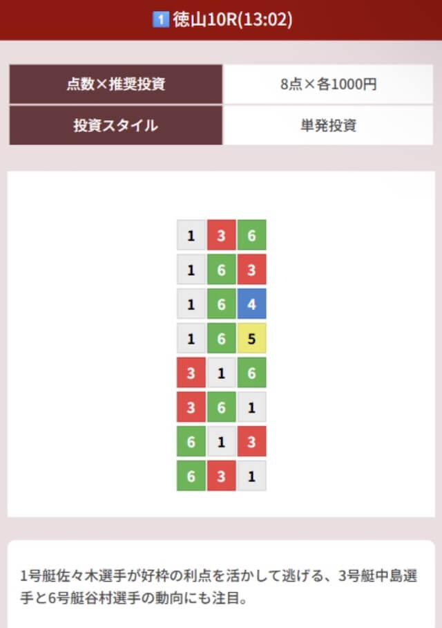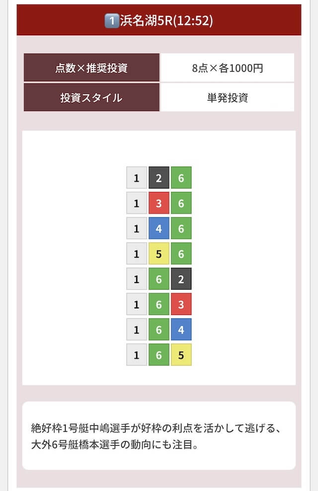 出走表と買い目を見て気になったのは、⑥号艇を買い目に入れていないことです。