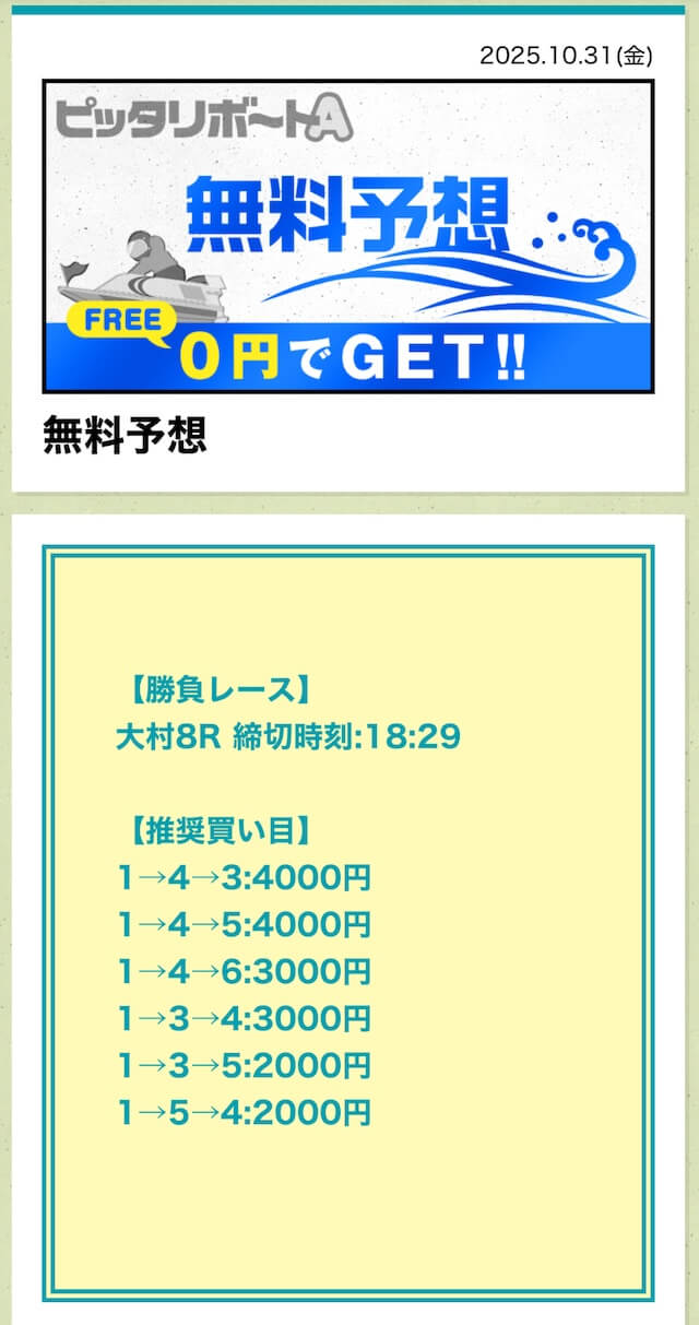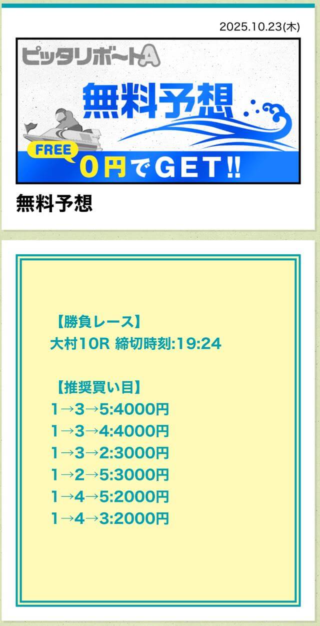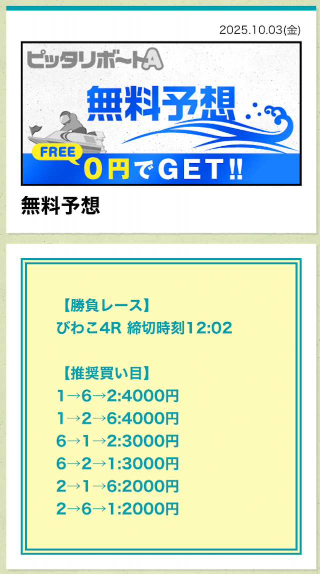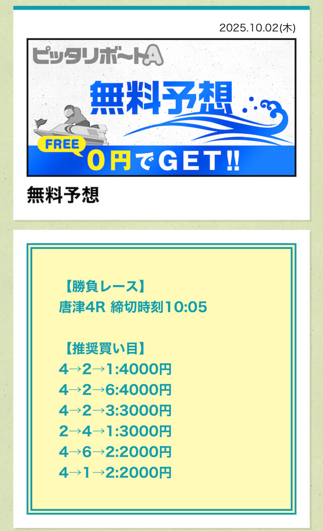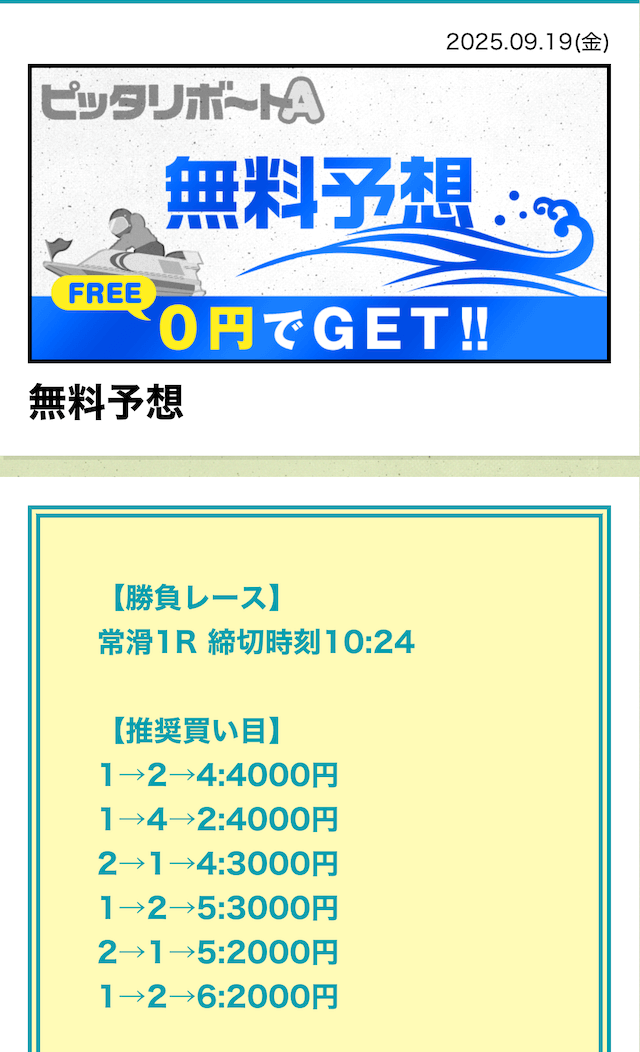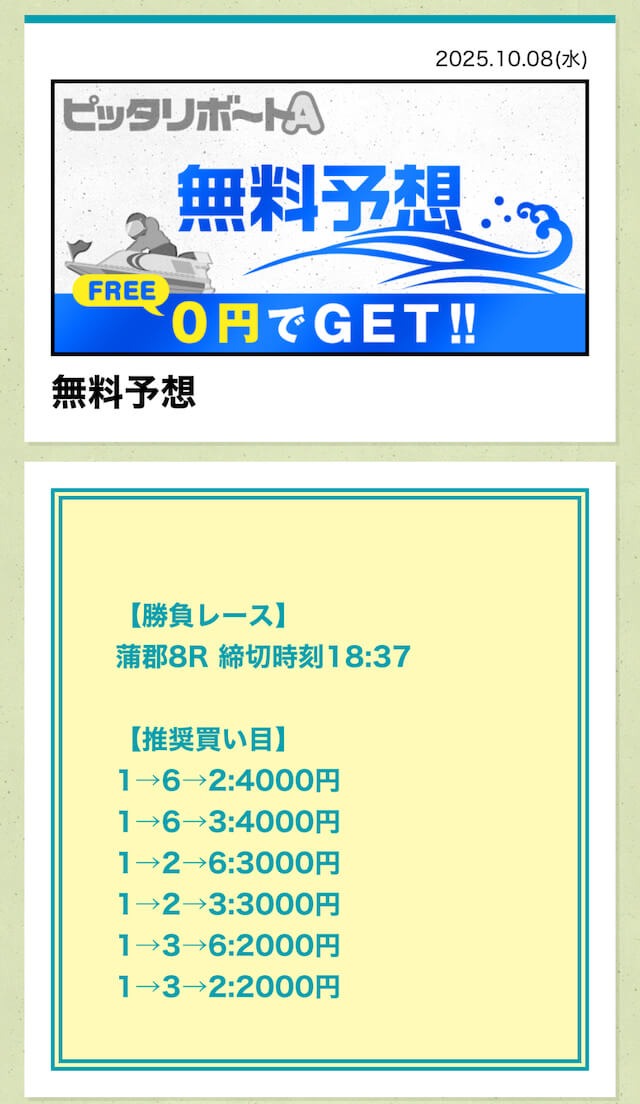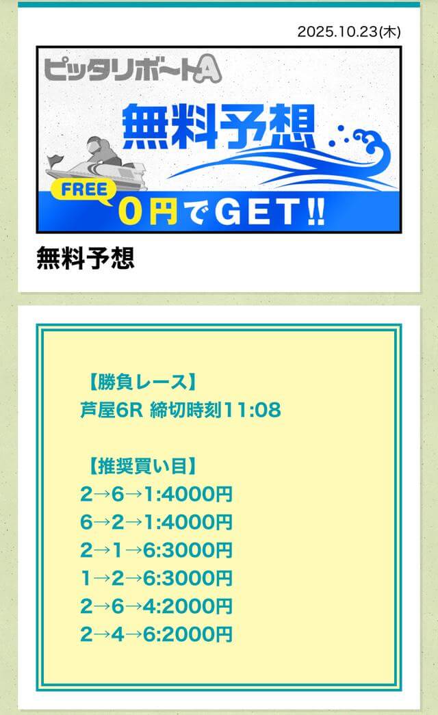 - ピッタリボートAの魅力は無料予想の予想精度の高さかな!実際に10万円を超える払い戻しも獲得しているし、短期間で大勝ちできるからマジでオススメです。投稿日:2025/01/29