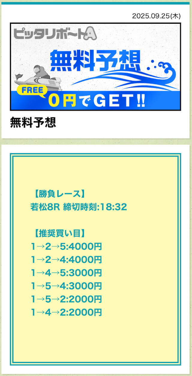 - 無料予想稼げたので、登録特典使って有料予想もチャレンジしたところ、見事に転がし成功しました。約20万勝ちです。やっと本物の予想サイトに出会えたかもです。投稿日:2025/01/27