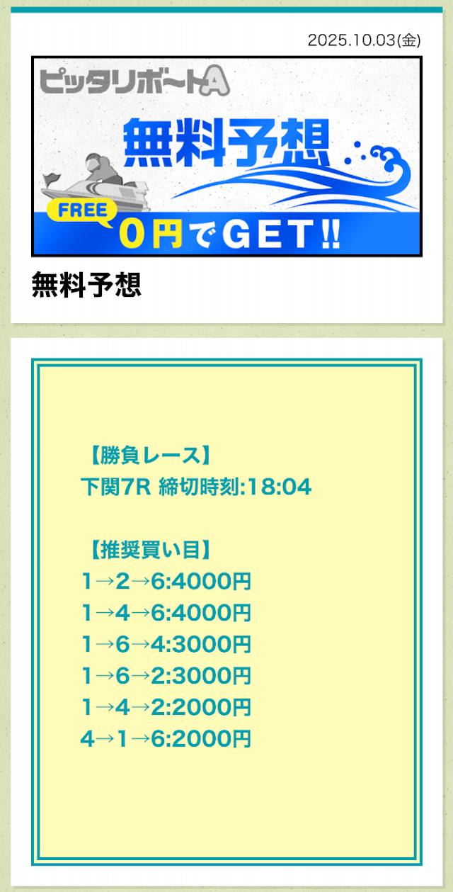 - 無料予想の的中率はまぁまぁ。でも爆発力がない。安定はしてるけど、万舟狙いとかの面白みはないかな…。大勝ちしたい人には向いてないかも。投稿日:2025/03/18