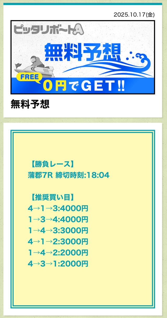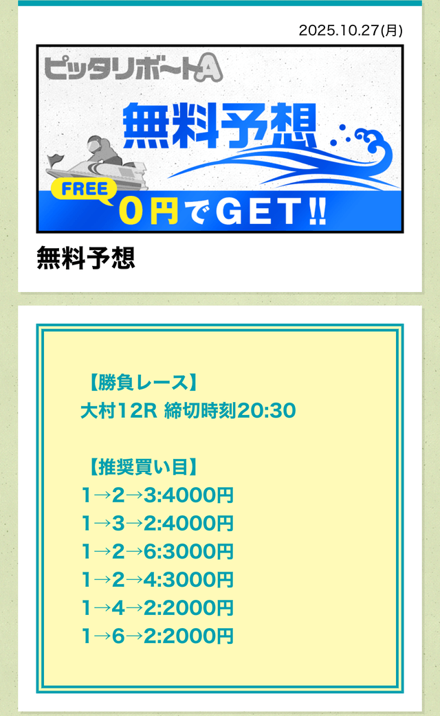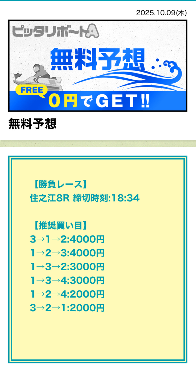 - 2025/10/31的中 無料予想で51,200円獲得2025/10/31的中 無料予想で18,000円獲得2025/10/29的中 無料予想で81,500円獲得2025/10/27的中 無料予想で39,000円獲得2025/10/25的中 無料予想で46,500円獲得2025/10/24的中 無料予想で91,600円獲得2025/10/24的中 無料予想で34,800円獲得2025/10/19的中 無料予想で20,700円獲得2025/10/16的中 無料予想で34,800円獲得2025/10/13的中 無料予想で22,800円獲得